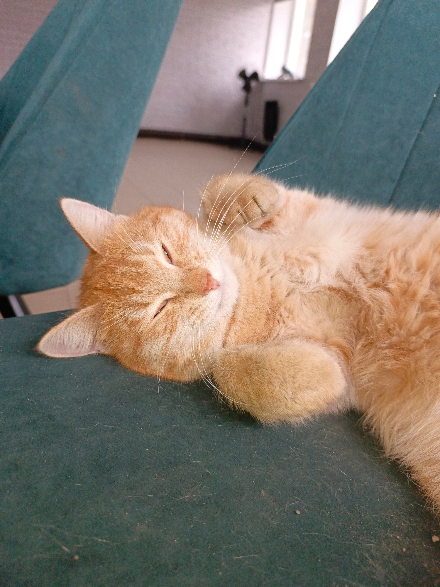 A ginger cat is sleeping on a green chair. The cat is curled up on its side with its eyes closed and one paw raised near its face. The background shows part of a room with another green chair and a wi…read more