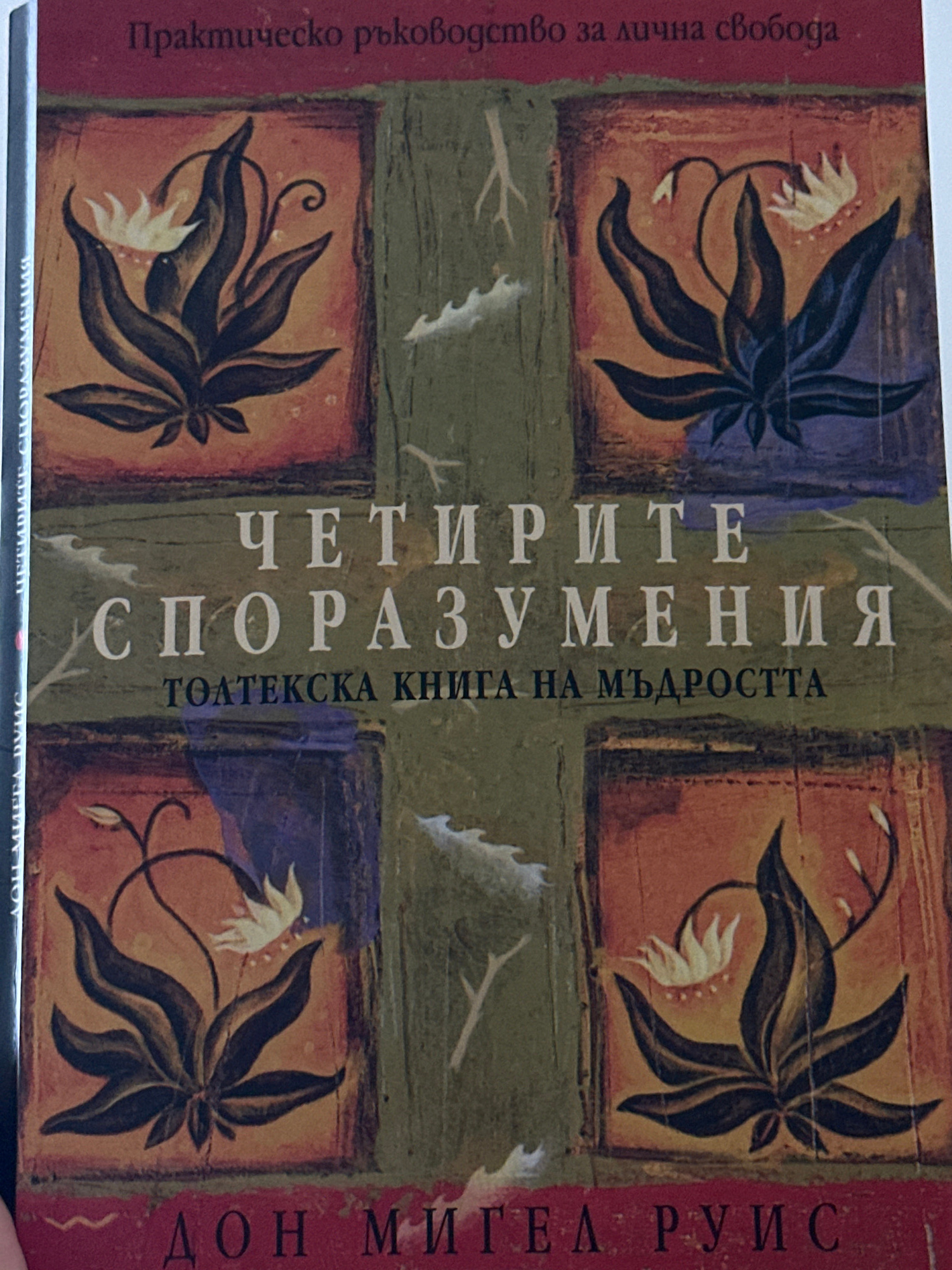 The image is of a book cover, displaying the title "ЧЕТИРИТЕ СПОРАЗУМЕНИЯ" (The Four Agreements) in Bulgarian, with the subtitle "ТОЛТЕКСКА КНИГА НА МЪДРОСТТА" (A Toltec Wisdom Book). The author's nam…read more