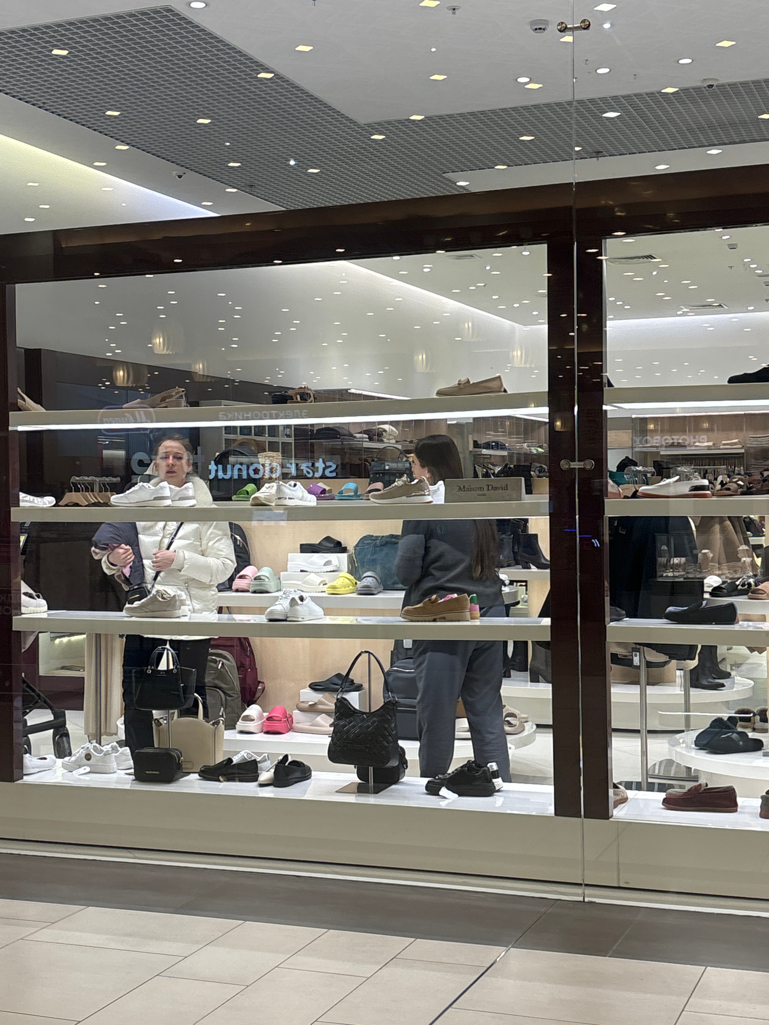 The image shows the storefront of a shoe and accessories shop. Display shelves behind the window showcase various shoes, handbags, and other items. Two people are reflected in the glass storefront. Th…read more