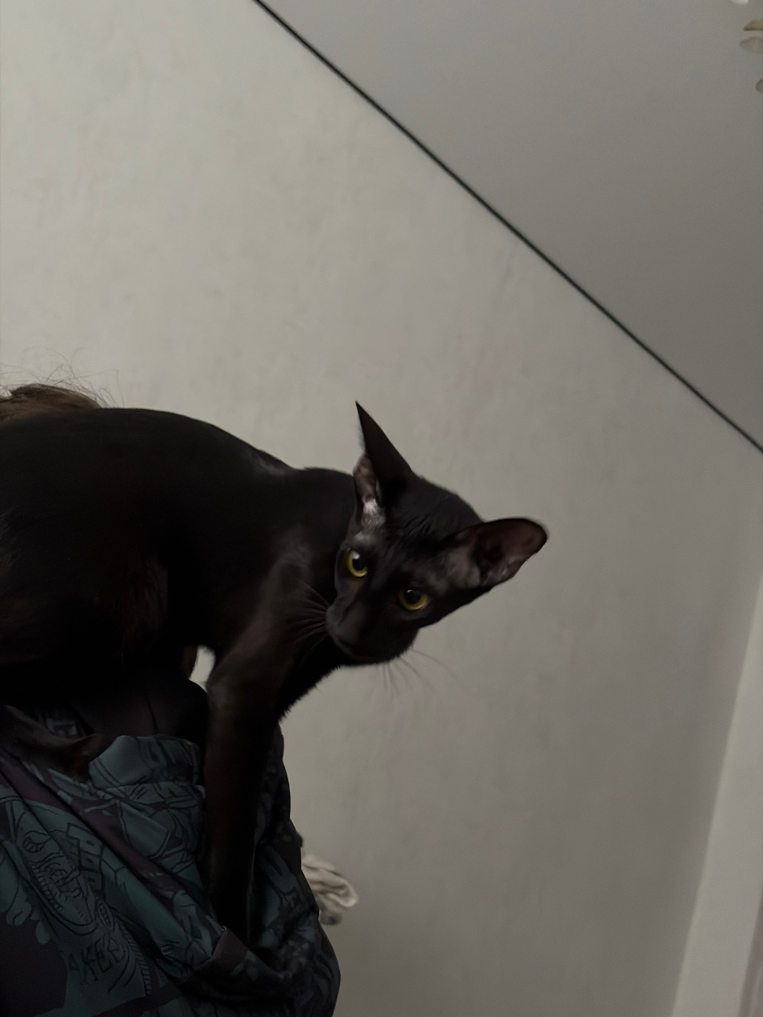 A black cat with yellow eyes is the primary subject, perched on top of patterned fabric, likely clothing or bedding. The background consists of white walls or surfaces meeting at an angle. No people a…read more