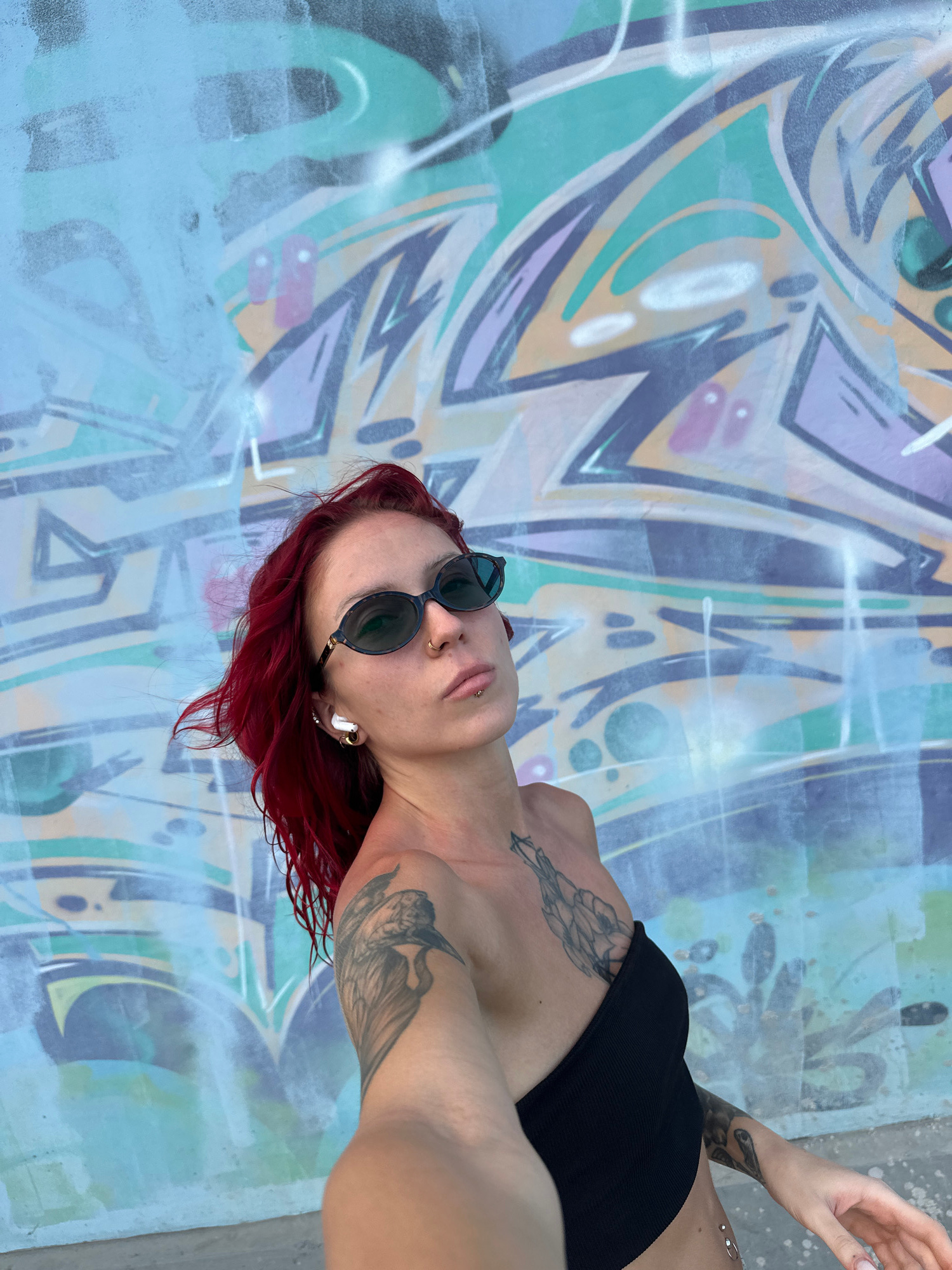 A woman with red hair and sunglasses, wearing a black top, is standing in front of a graffiti wall in Tibubeneng, Indonesia. She has multiple tattoos on her arms and chest, as well as piercings in her…read more