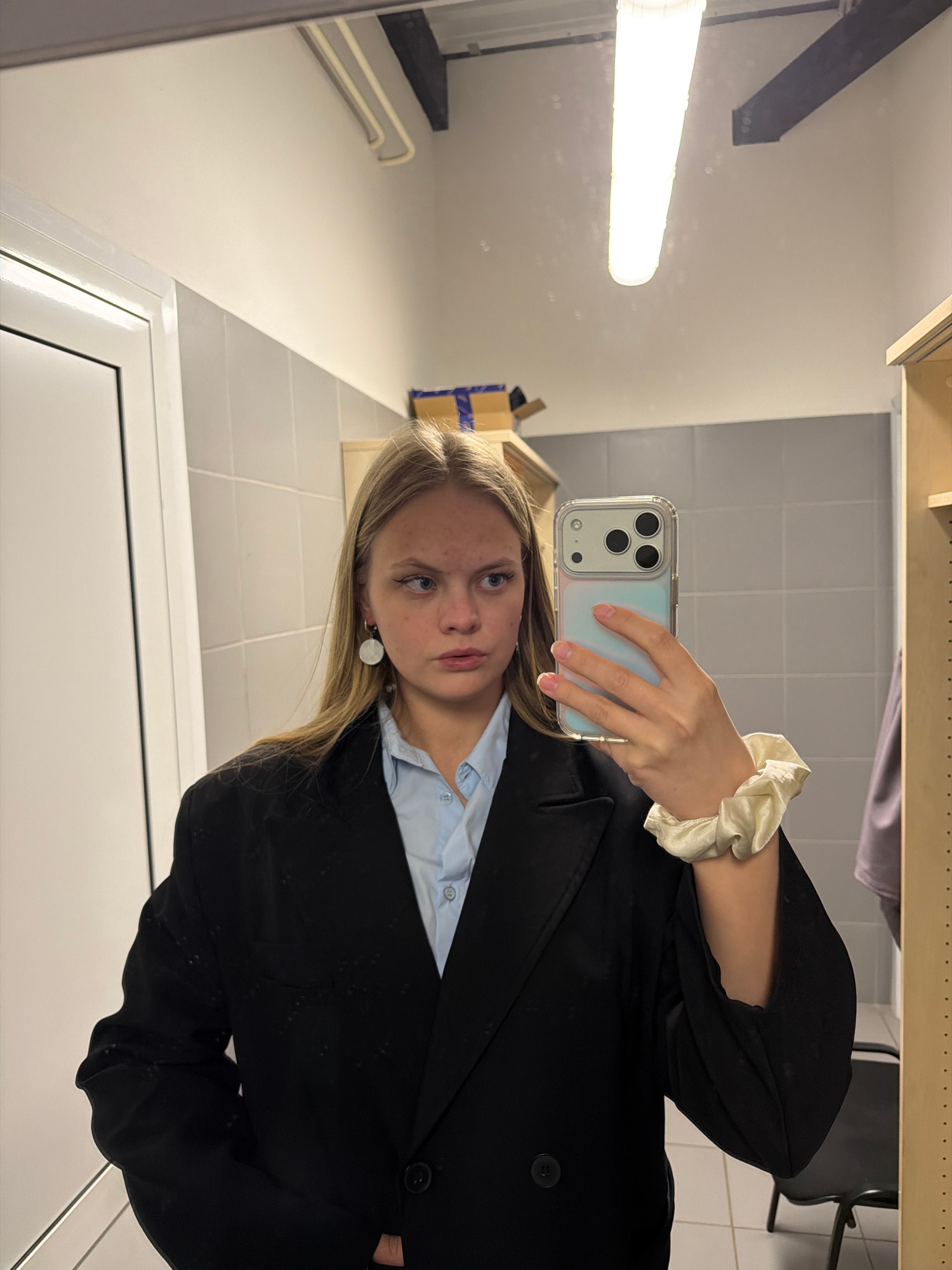 A young woman is taking a selfie in a bathroom. She is holding an iPhone with a clear case in her left hand. She is wearing a light blue collared shirt under a black blazer. A cream-colored scrunchie…read more