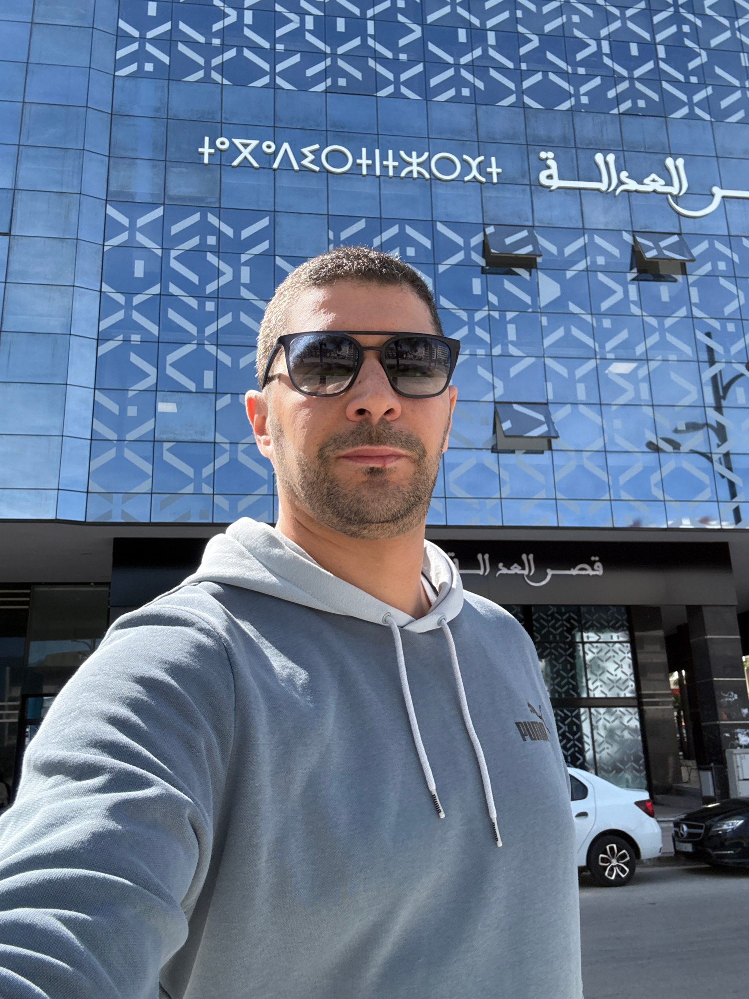 An adult man takes a selfie outdoors in bright daylight, his head tilted slightly to the side. He wears a light grey hooded sweatshirt with the "puma" logo visible on the chest and is sporting dark su…read more