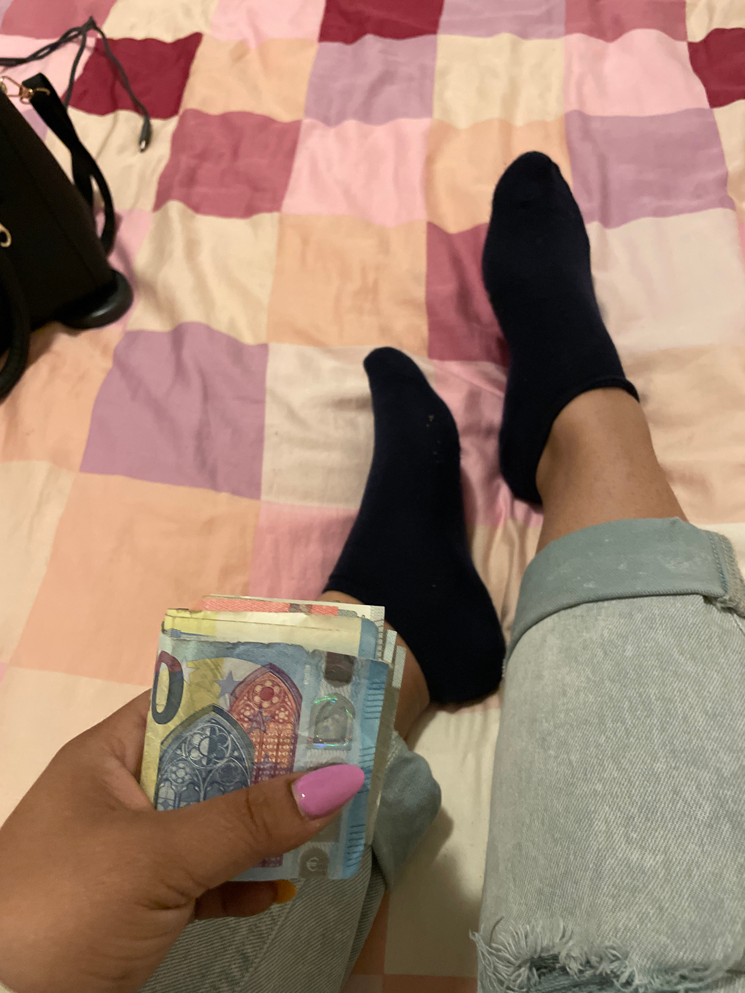 A person wearing socks and jeans is sitting on a bed with a multicolored checkered pattern. They are holding a stack of Euro banknotes in their right hand, with a pink fingernail visible. A black purs…read more