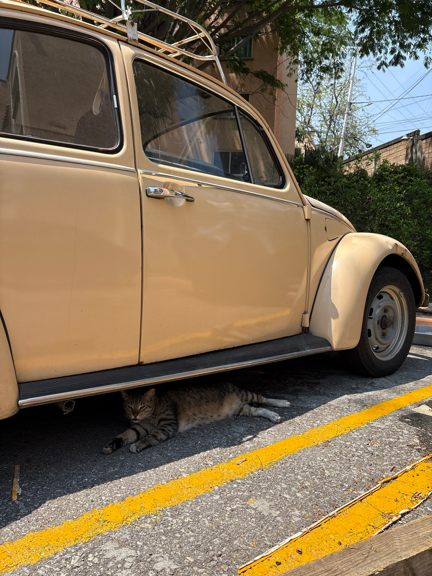A medium shot depicts a vintage tan Volkswagen Beetle parked along a street with yellow demarcation lines. A tabby cat lies stretched out in the shade beneath the vehicle's side. The Beetle has a roof…read more