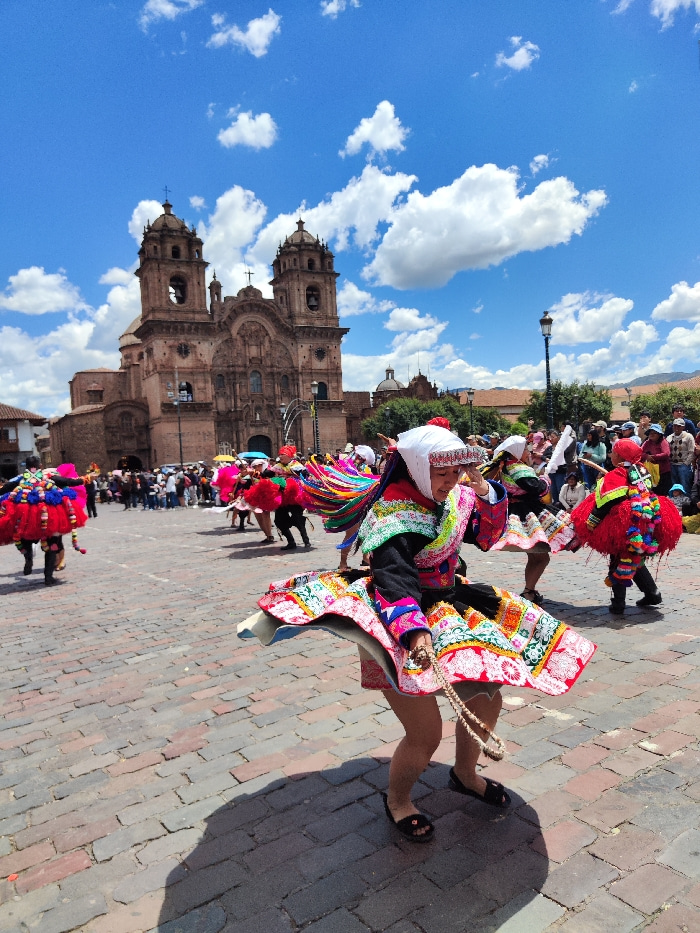 A vibrant scene unfolds in a brick-paved square under a blue sky with scattered clouds. Dancers in colorful traditional attire are performing, their skirts flaring out with motion. In the background,…read more