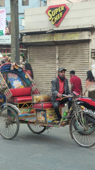 The image captures a daytime street scene in Dhaka, Bangladesh, identified by the distinctive cycle rickshaw and the "SUPER CHEF" sign, a known brand in the city. **Subjects and People:** A male rick…read more