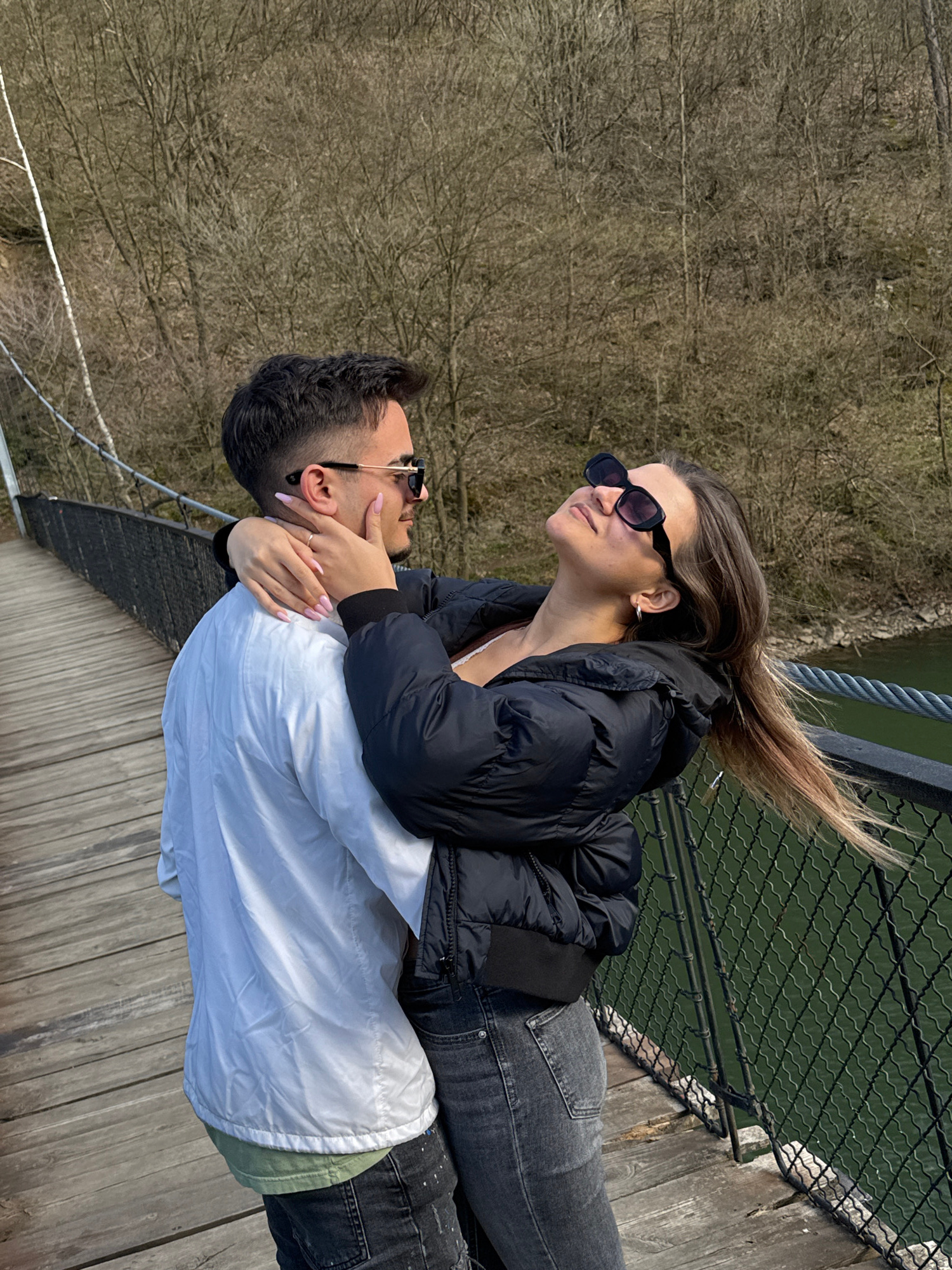 In Dolni Pasarel, Bulgaria, a woman wearing a black puffer jacket and sunglasses leans over a man with sunglasses, holding his face, as they stand on a wooden platform with a wire mesh fence. Behind t…read more