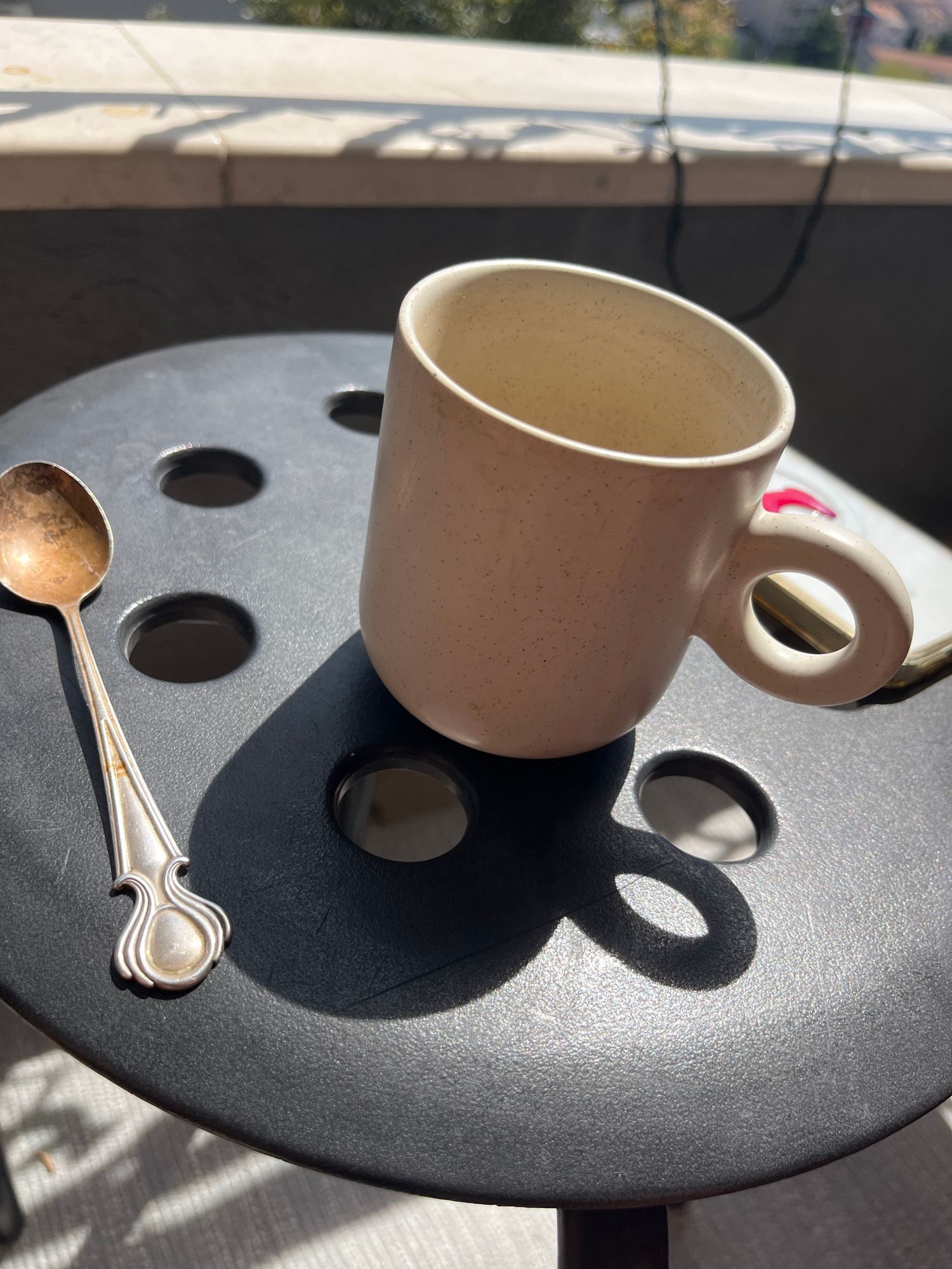 A beige ceramic mug with a round handle sits on a dark gray, perforated, round table. A tarnished silver spoon lies next to the mug. The scene is illuminated by sunlight, casting shadows of the mug an…read more