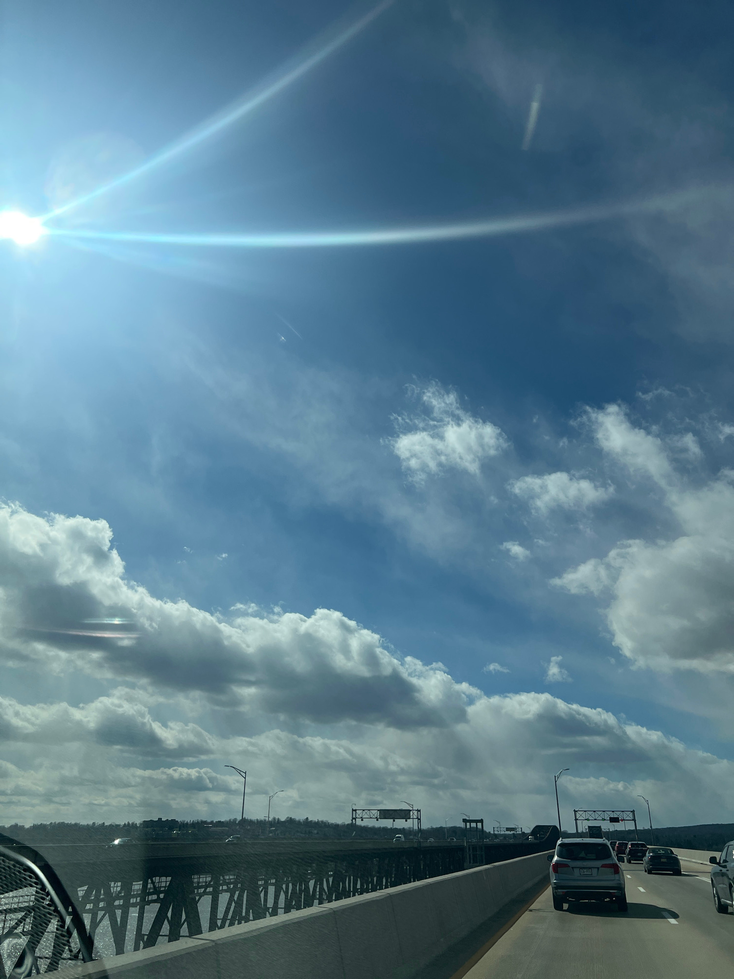 The image shows a view from a vehicle on a bridge, possibly the Newburgh-Beacon Bridge in Newburgh, New York. Traffic is present on the bridge, with cars and overhead traffic lights visible. The sky i…read more