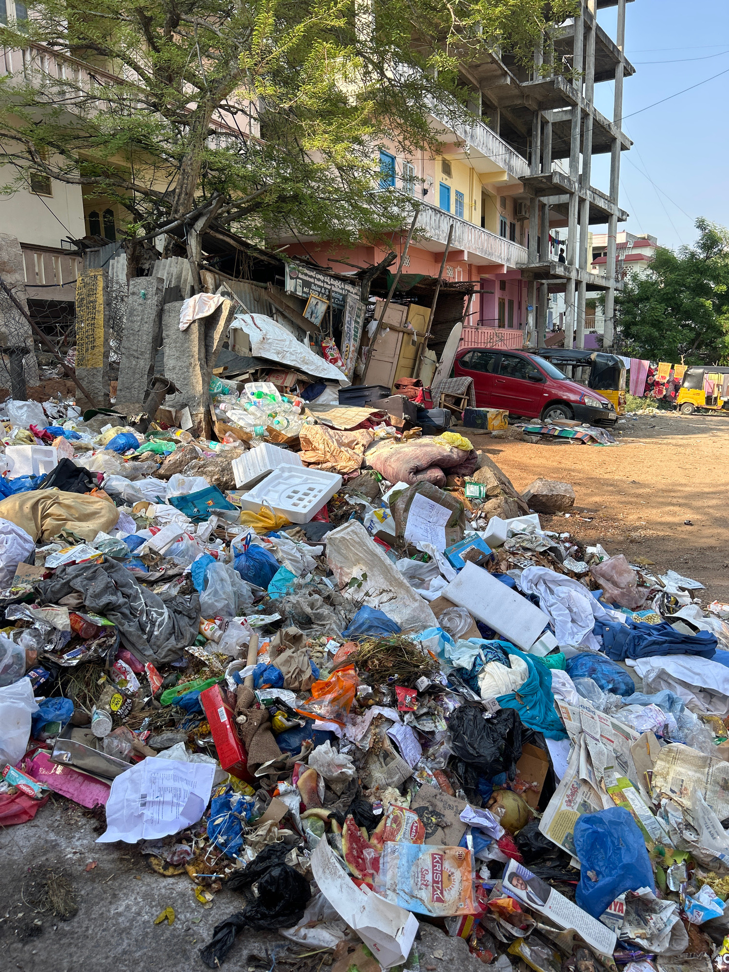The image depicts a large pile of garbage and debris in Puttaparthi, India. The refuse includes paper, plastic, food waste, textiles, and packaging materials. A red car and nearby buildings frame theβ¦read more