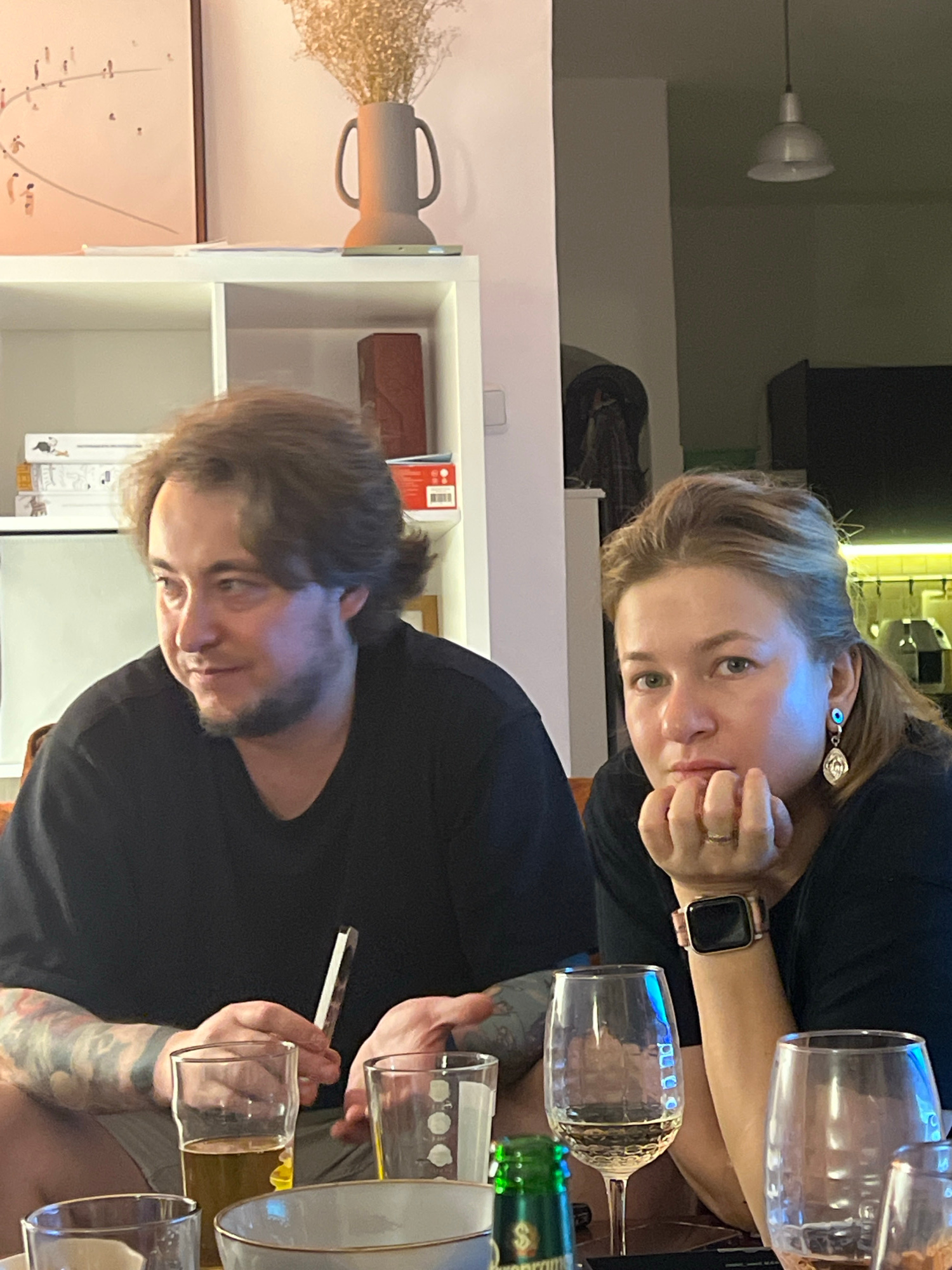 Two people are seated at a table, likely in a home setting. The woman, on the top of the image, has light hair, earrings, and a watch. She is looking at the camera with her hand near her face. The man…read more