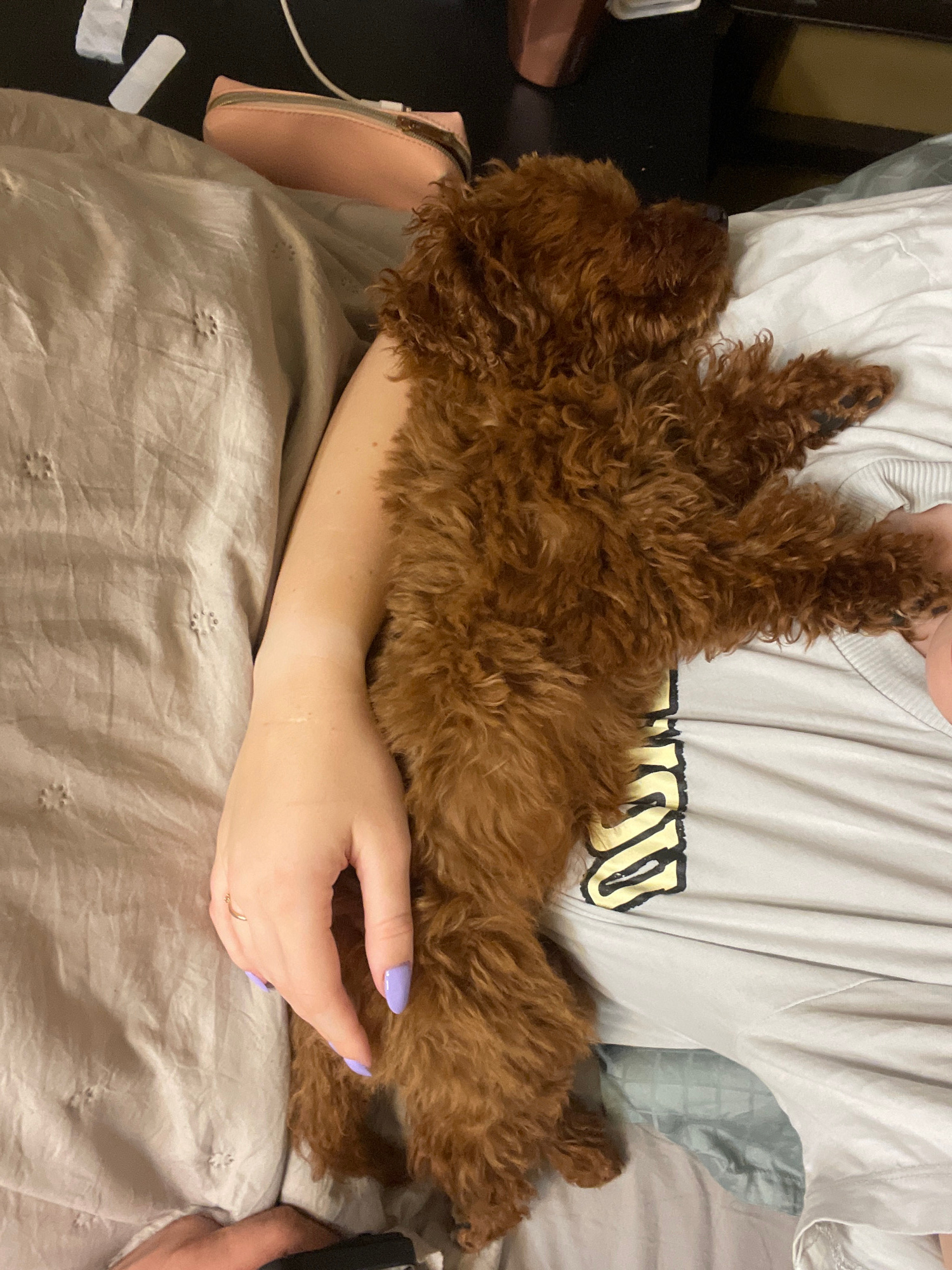 A reddish-brown, long-haired dog is cradled in a person's arms. The person is wearing a light-colored t-shirt with a word partially visible in black and gold lettering. The person's hand with light pu…read more