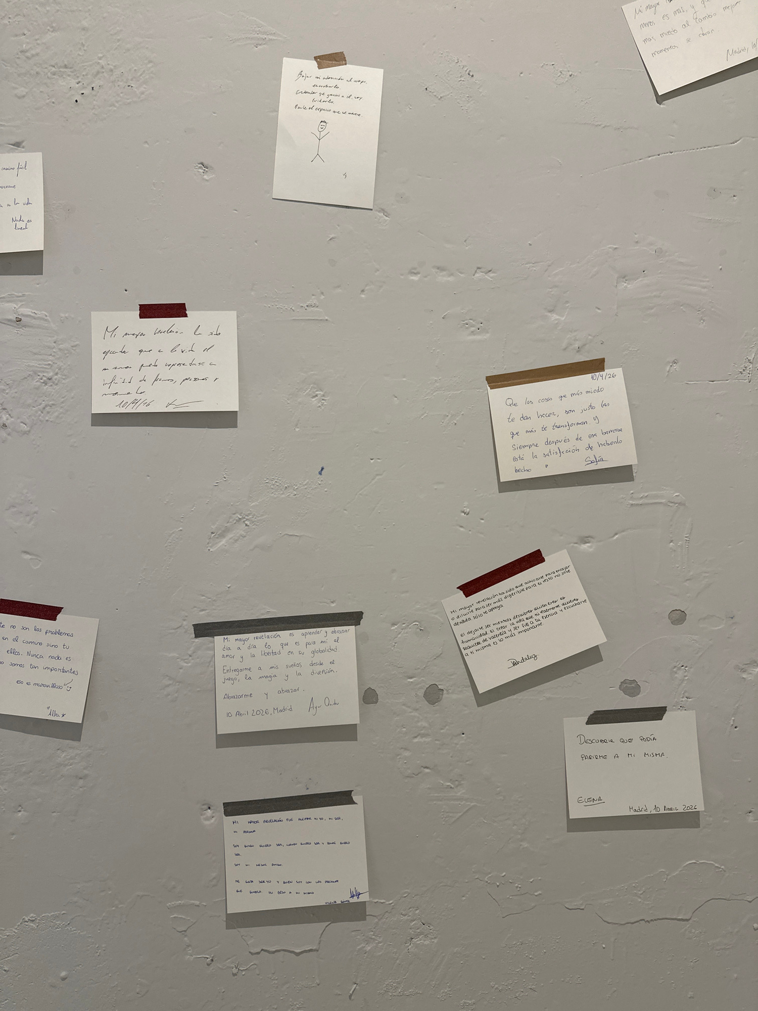 The image shows a textured, likely painted white, wall onto which several notes are affixed, presumably with tape, as evidenced by the visible tape pieces. These notes appear to be handwritten in Span…read more
