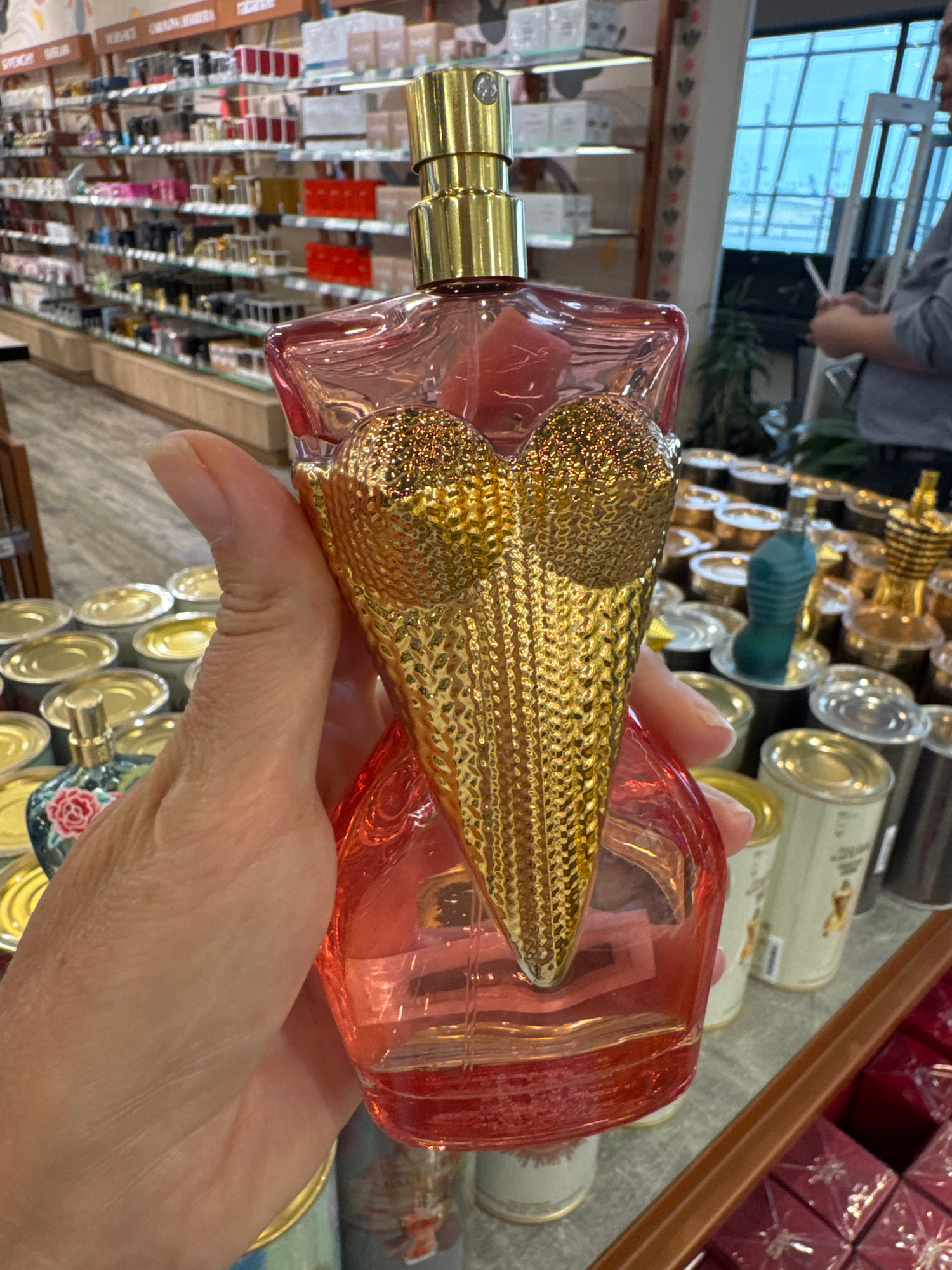 A hand holds a pink perfume bottle with a gold, patterned top. The background includes various products on shelves and other perfume bottles on a counter. The scene appears to be inside a shop selling…read more