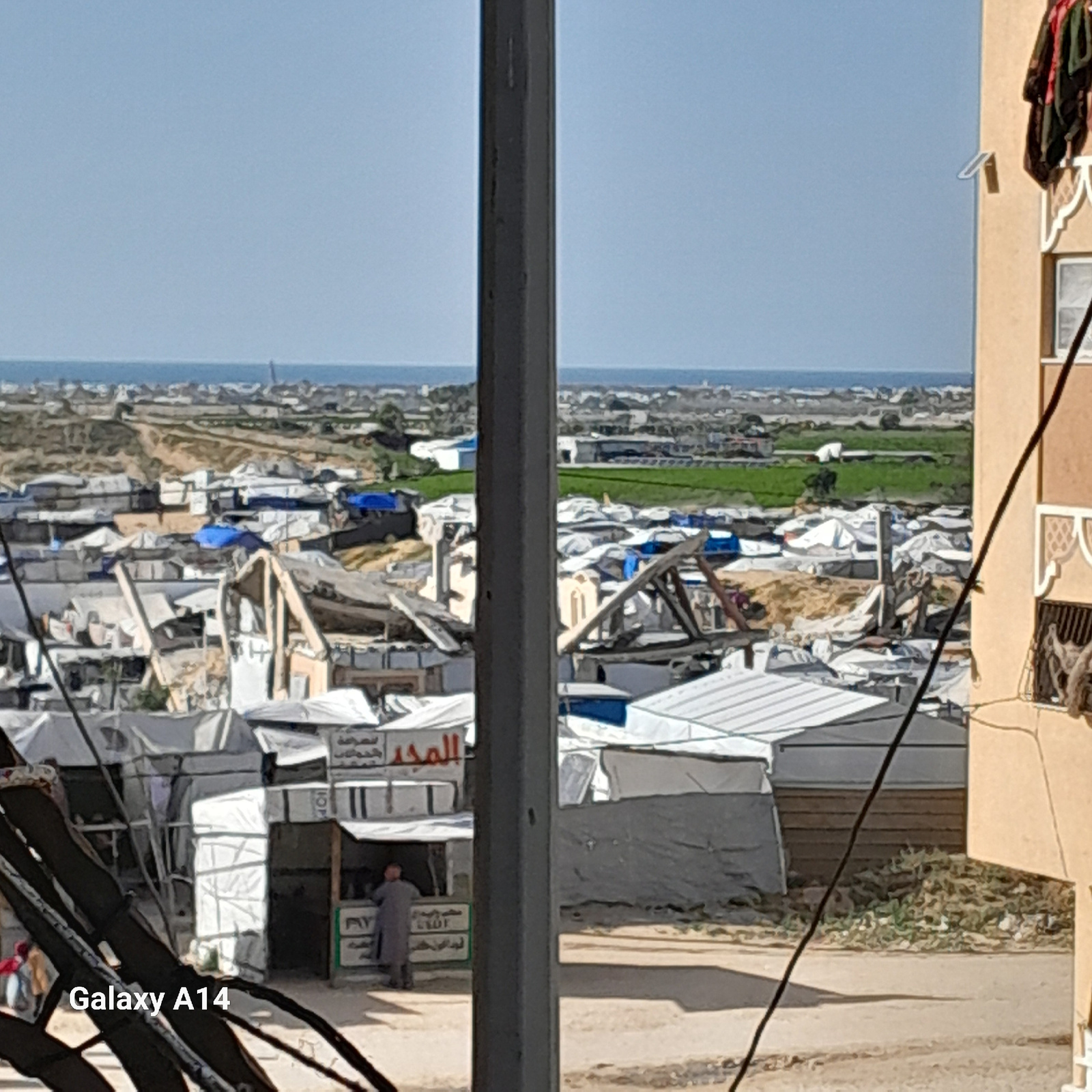 The image shows an overview of a refugee camp in Khan Yunis, Palestinian Territory, viewed from a building. Numerous white tents are visible, some partially collapsed, interspersed with debris and bui…read more