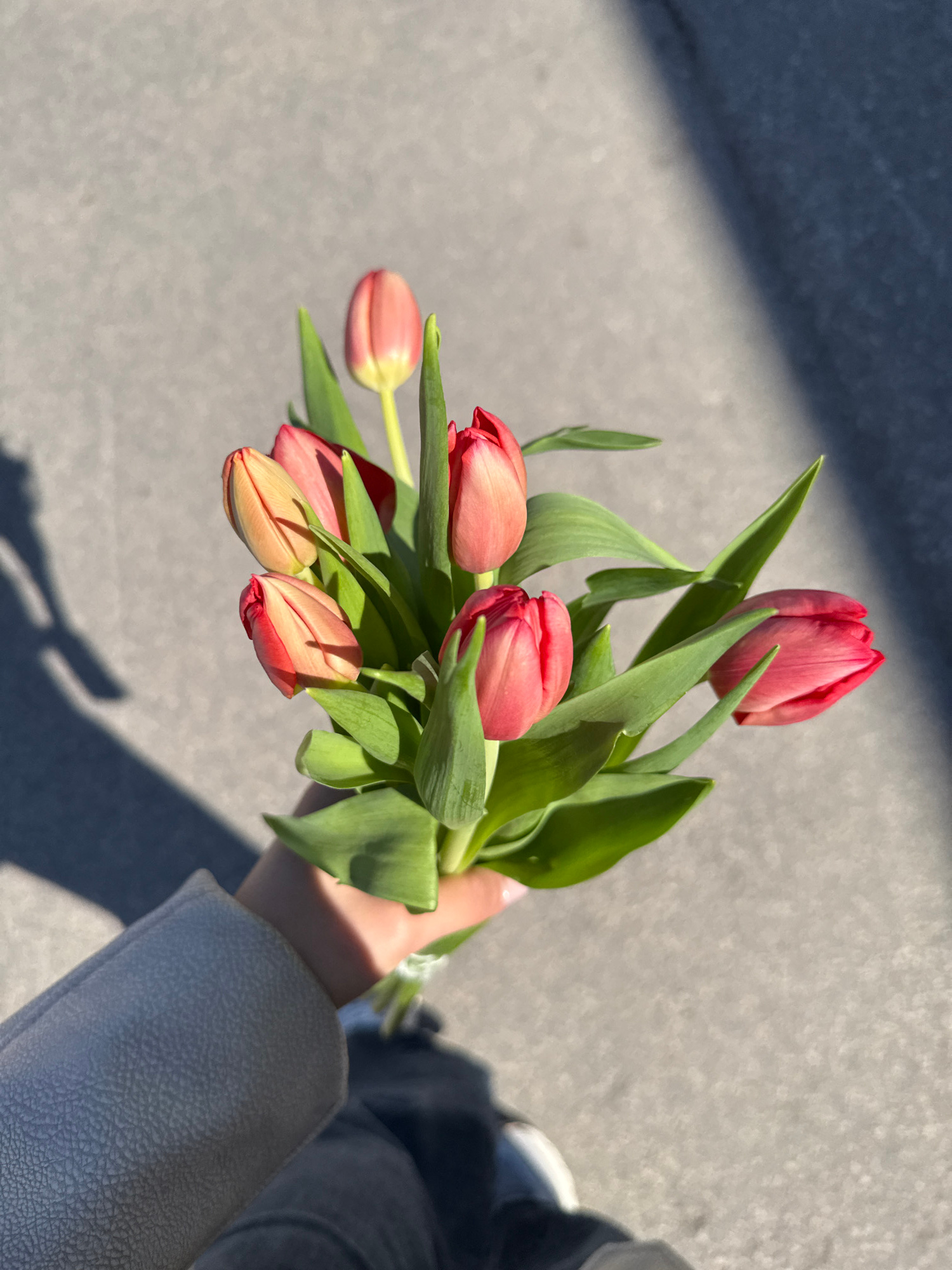 A person holds a bouquet of closed, red tulips in their left hand. The person is wearing a light-colored jacket with a hint of a white shoe visible. The tulips are tied together and have green leaves.…read more