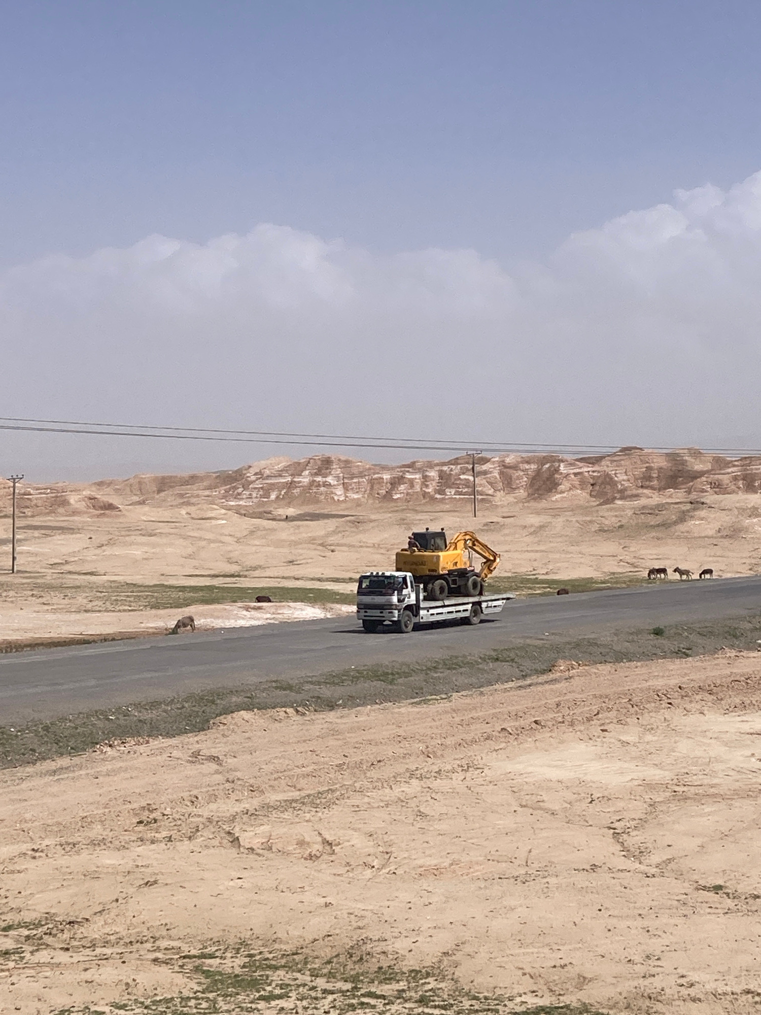 The image shows a desert landscape in Batezai, Pakistan. A low-loader truck carrying a yellow excavator travels on a paved road. Along the side of the road, scrubby vegetation grows. In the background…read more