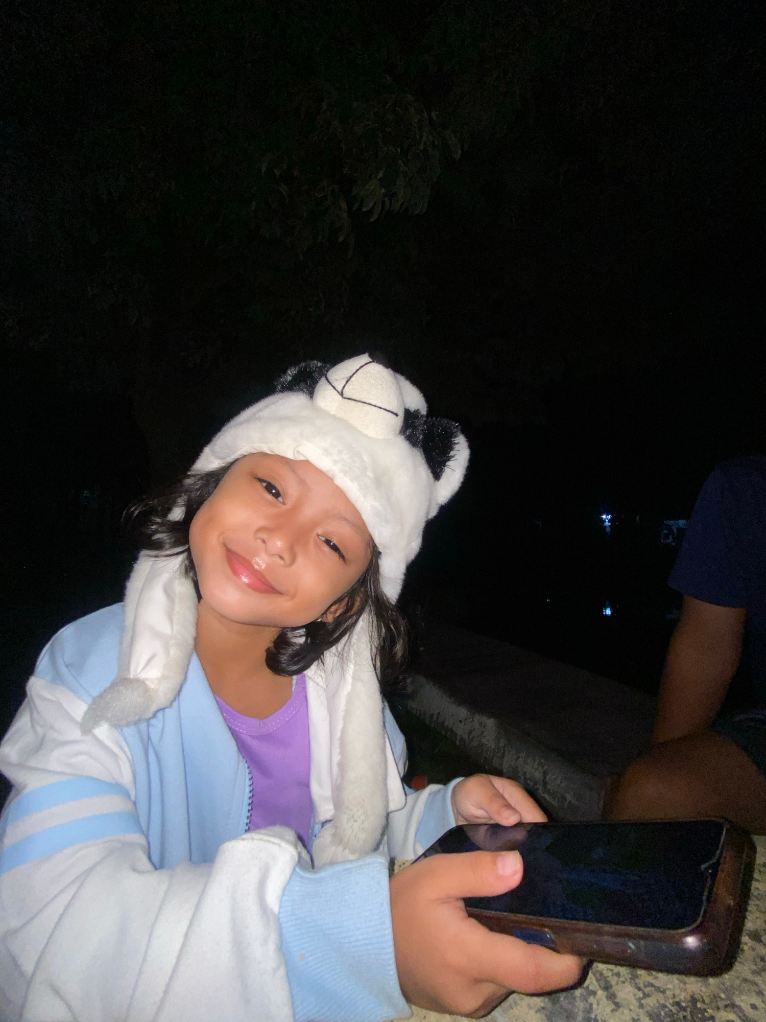 A young girl is holding a smartphone, possibly taking a selfie. She is wearing a white and black panda hat. She is also wearing a light blue jacket over a purple top. The background is dark, possibly…read more