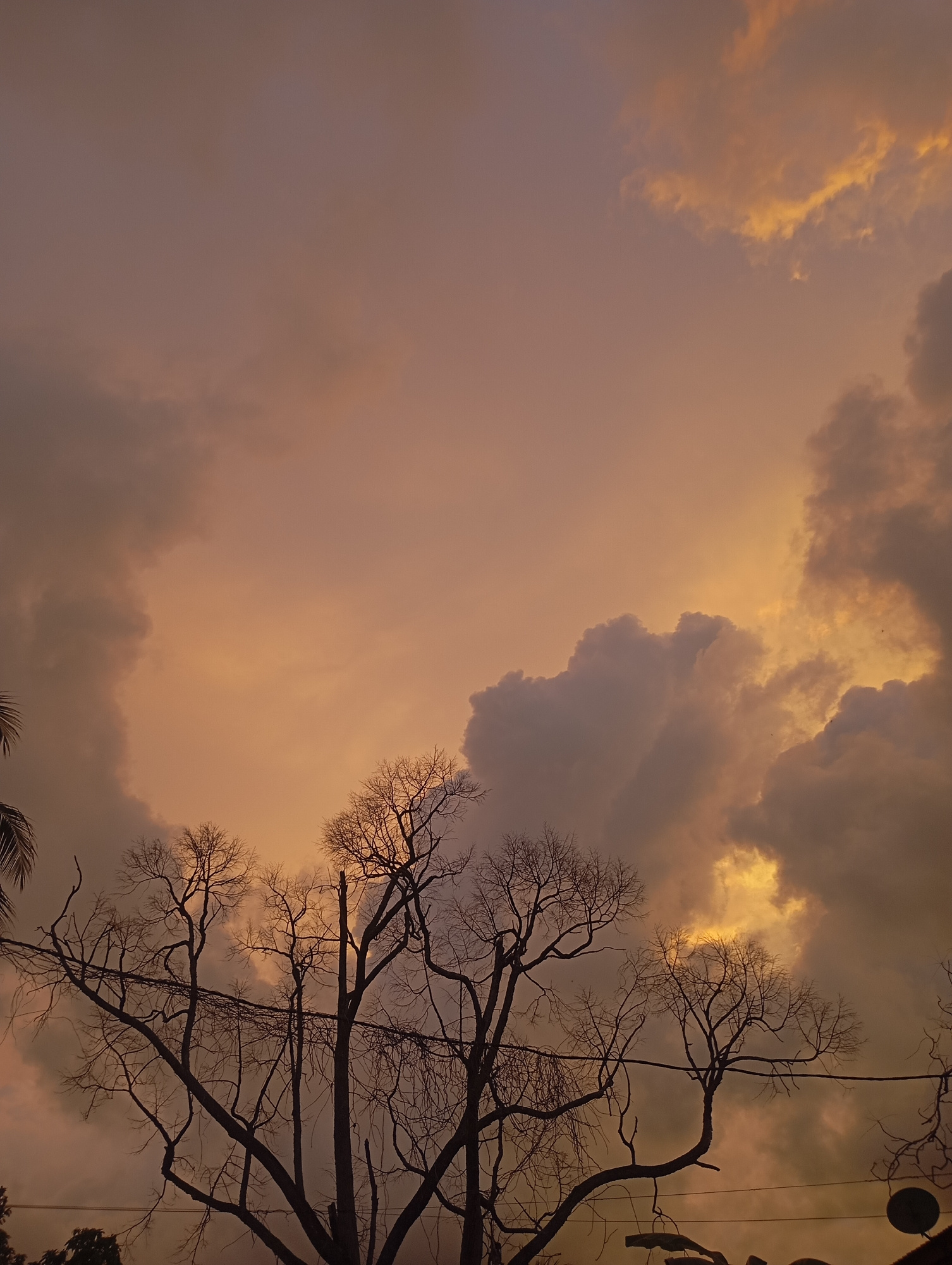 The image shows a view of the sky at dusk, likely in Mideuenjok, Indonesia, though the location is not definitively proven in the image. A cluster of bare trees with thin branches occupies the lower p…read more