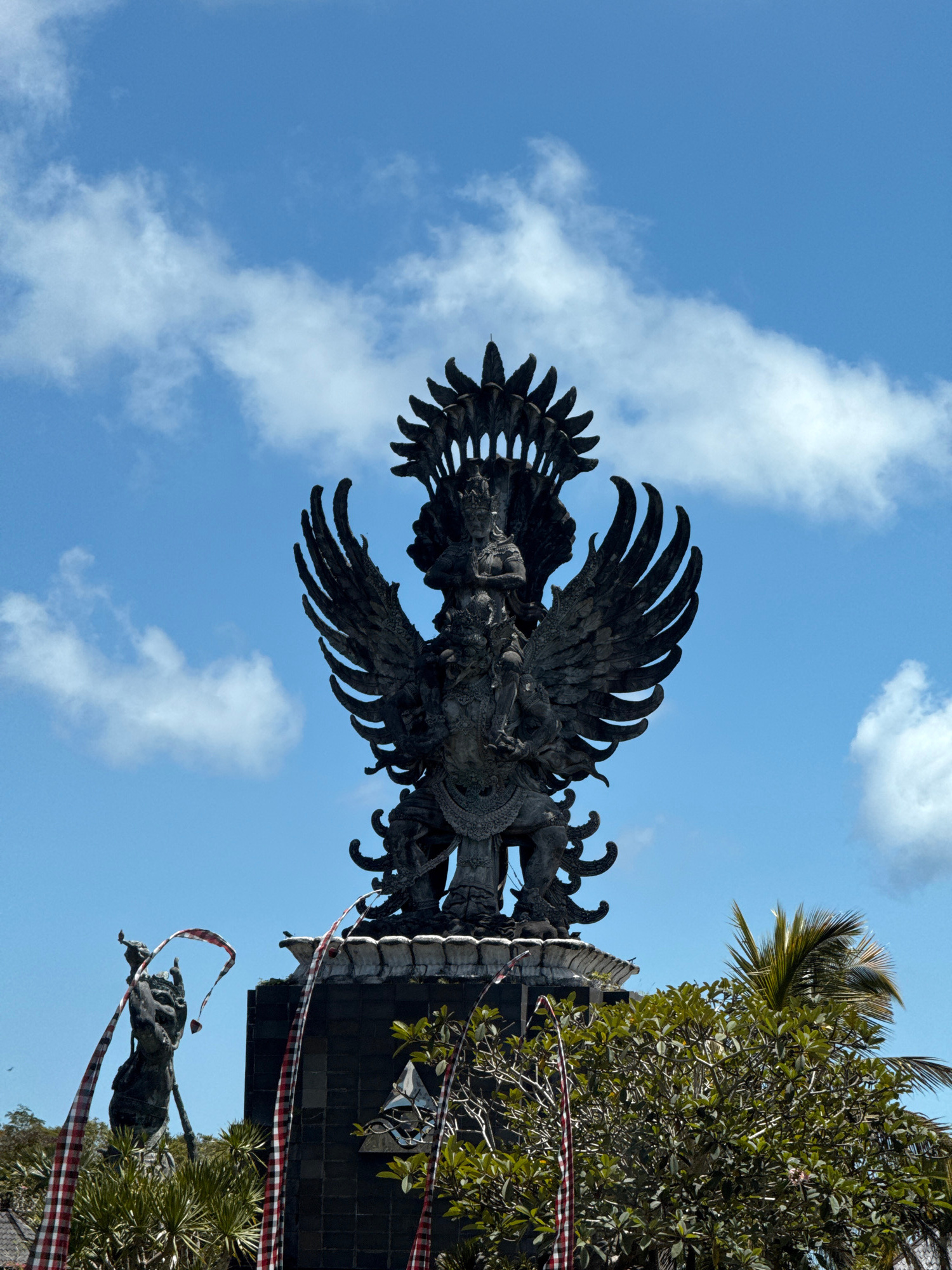 The image, taken in Kuta Selatan, Indonesia, captures a grand, dark-colored stone or metal statue of a mythical winged figure, likely a Garuda, soaring against a clear, bright blue sky dotted with sca…read more