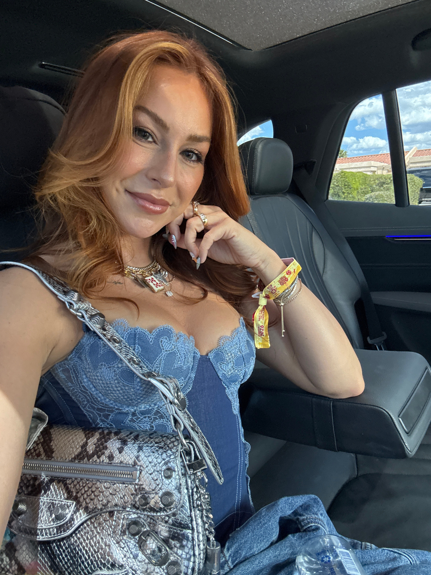 A woman is reclining in the back seat of a vehicle, smiling at the camera. She has red hair and fair skin and is wearing a blue top with lace detailing. She is wearing several rings on her fingers and…read more