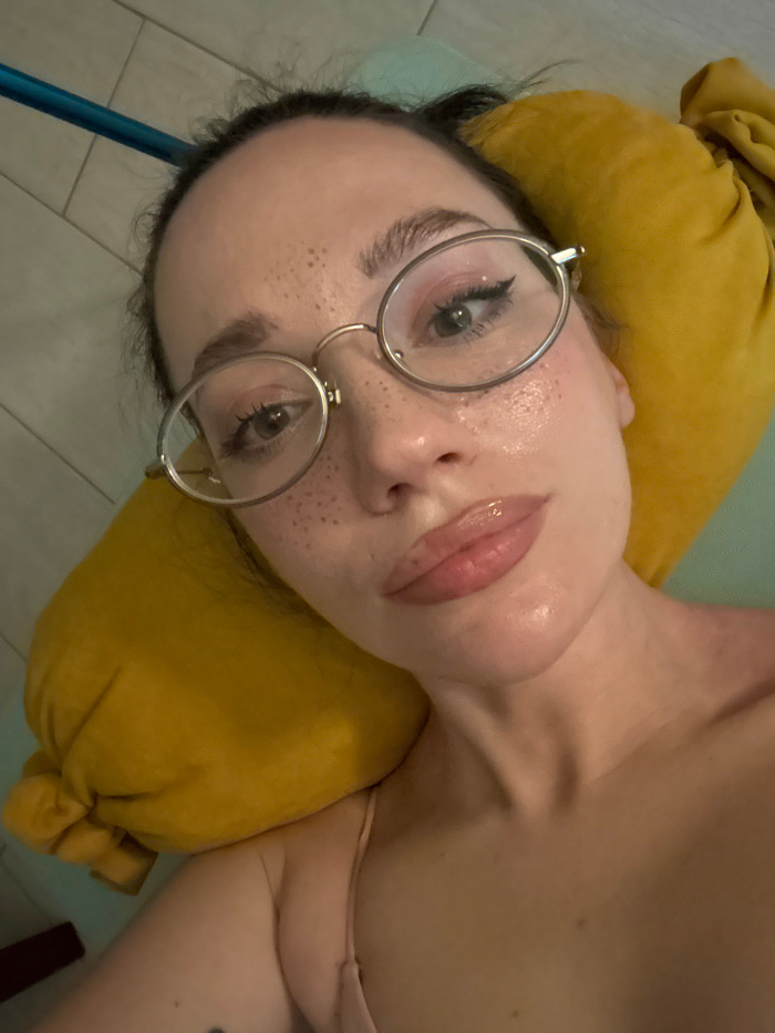 A close-up, tilted portrait shows a person's face and upper chest while they are lying down. The person has fair skin, prominent freckles across their nose and upper cheeks, and dark, neatly shaped ey…read more