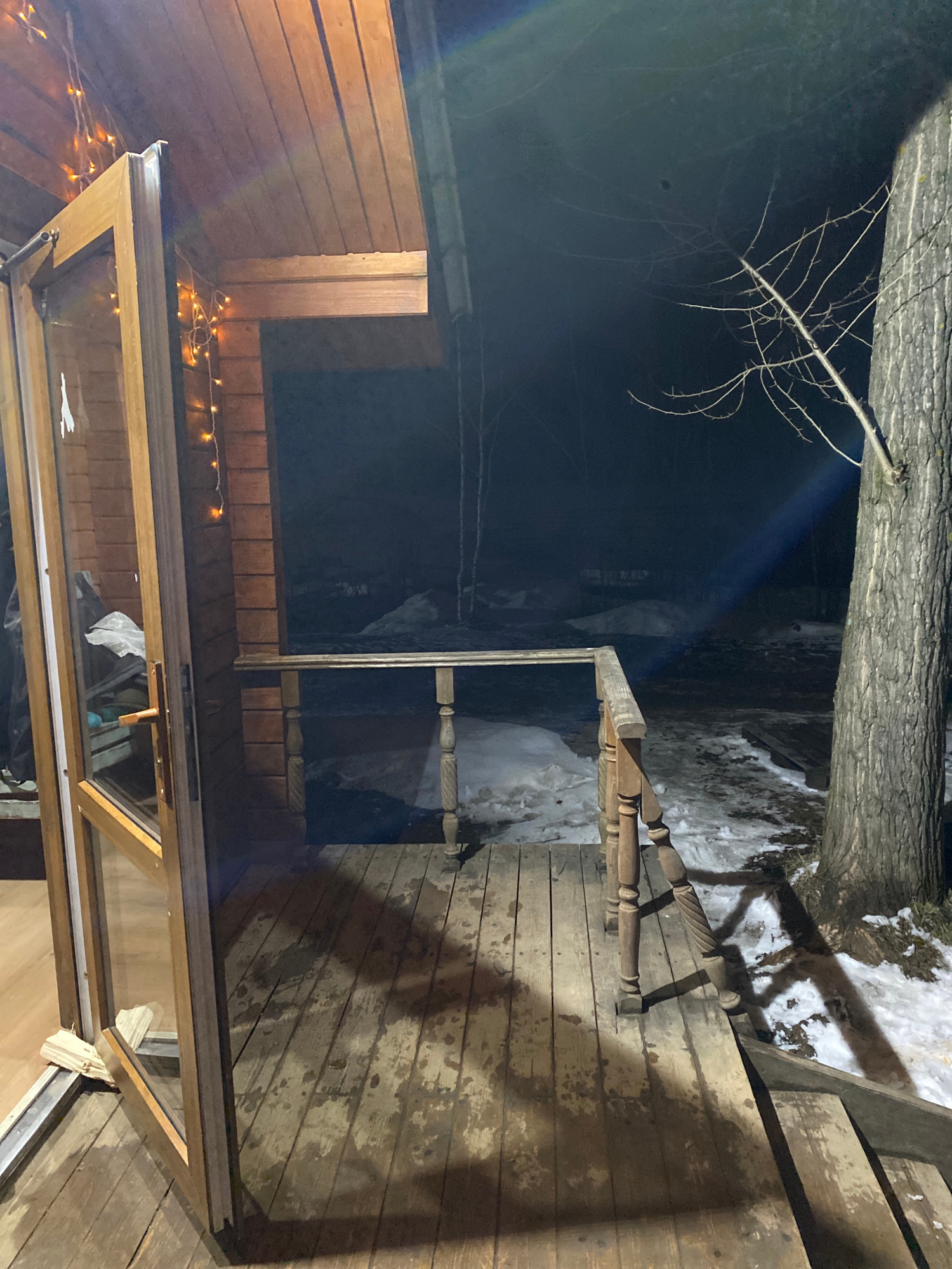 The image shows a night scene in Chaikovsky, Russia. A wooden porch is visible, with wooden planks and a railing. The ground outside the porch is covered in snow and ice. A tree trunk is visible near…read more