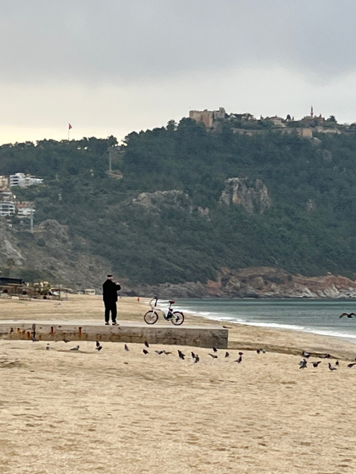 The image depicts a beachfront scene in Alanya, Turkey, with the prominent Alanya Castle hill dominating the background. In the foreground, a wide expanse of light brown sand covers the lower half of…read more