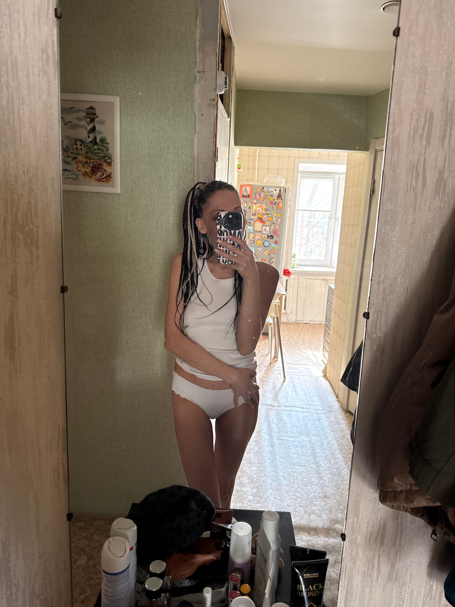 A woman is seen in a mirror, holding a smartphone in front of her face, with a white tank top and underwear. The reflection includes the interior of a room with light green walls and a picture hangingβ¦read more