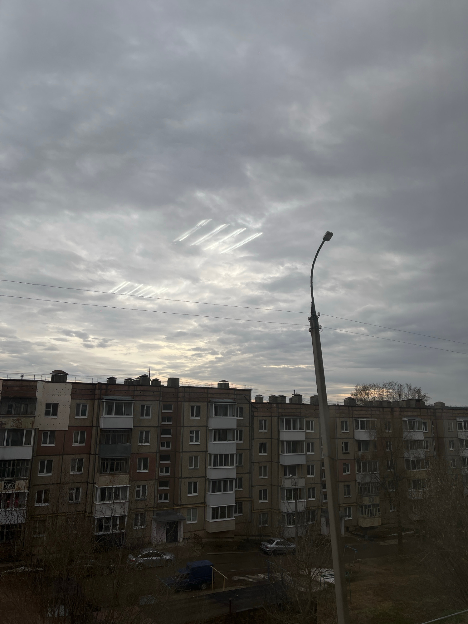 The image is an upward-looking view in Votkinsk, Russia, featuring a block apartment building under a cloudy sky. The building is multi-storied with numerous windows. A street lamp is positioned in fr…read more