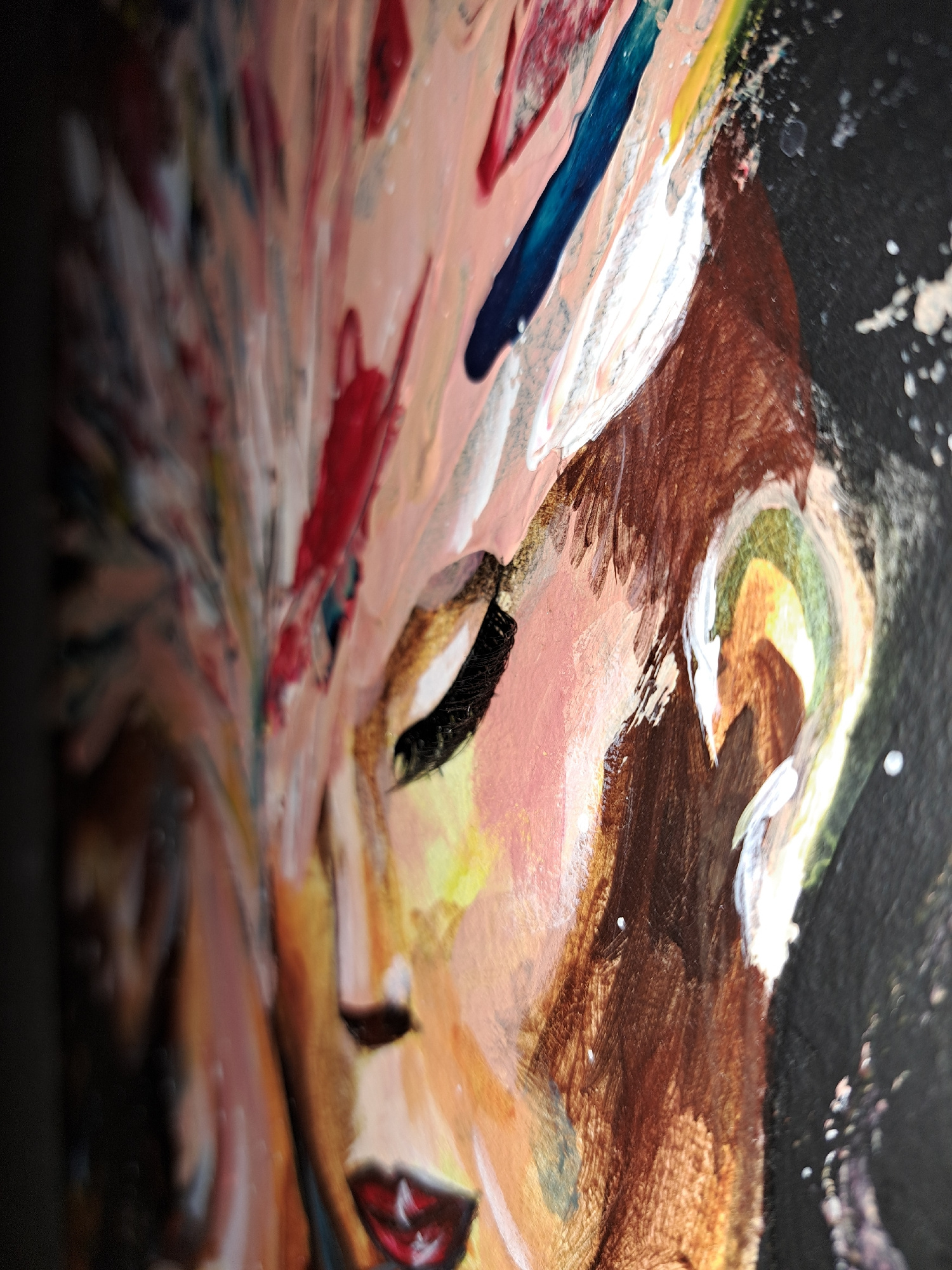 The image is a close-up, abstract-style painting. It depicts a mix of colors including black, brown, white, red, blue, yellow, and pink. The brushstrokes are visible and textured. The composition seem…read more
