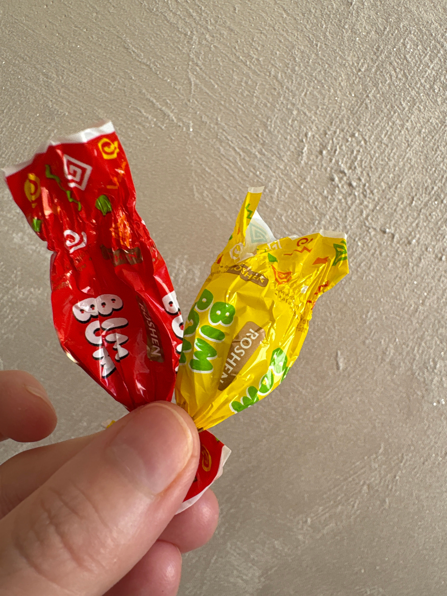 A person is holding two pieces of candy in their hand. The candy wrappers are crumpled and appear to be made of a foil-like material. One wrapper is yellow and the other is red. Both wrappers feature…read more