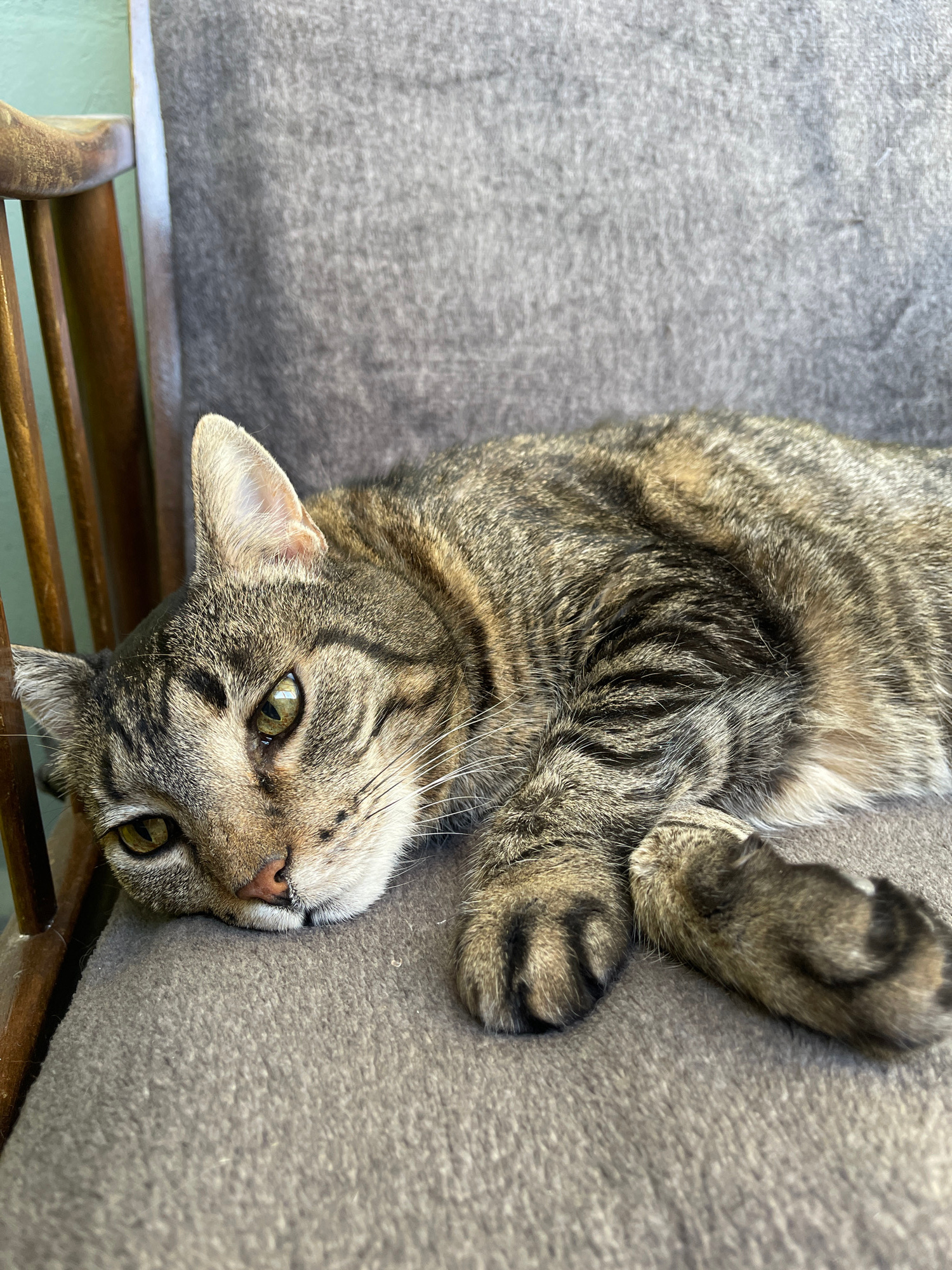 A tabby cat is lying on a gray blanket on a wooden surface. The cat's head is resting on the edge of the blanket, with its body angled towards the upper right of the image. Its paws are visible near t…read more