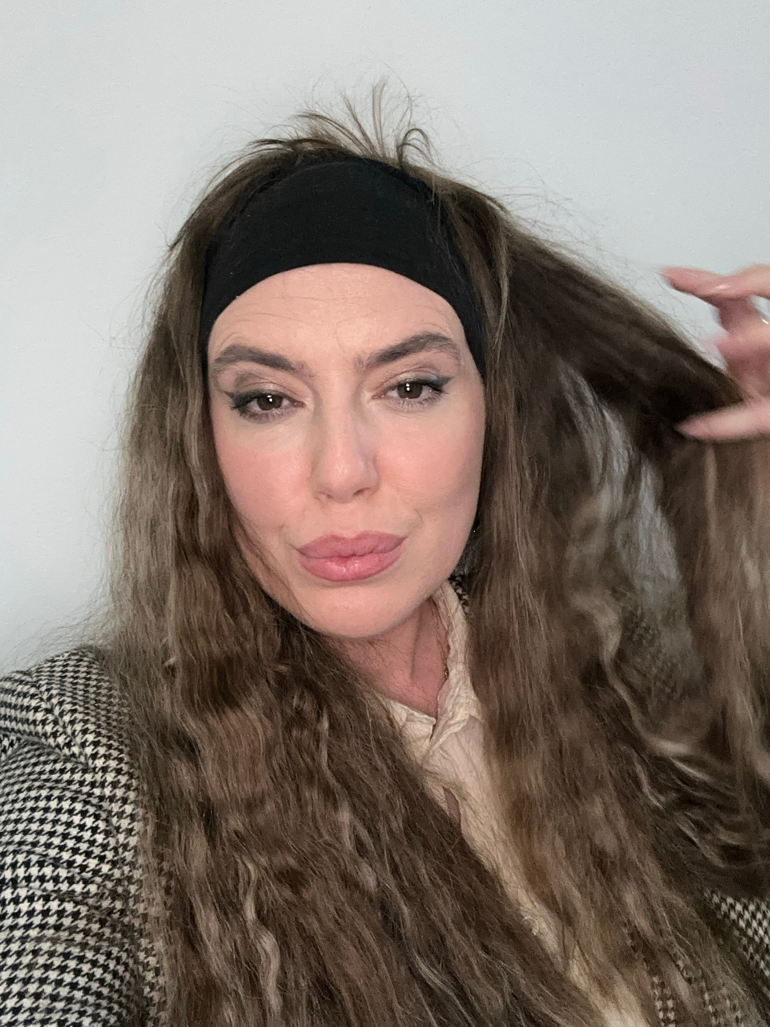 A woman with light skin and brown eyes, wearing a black headband, is looking at the camera. She has long, wavy, light brown hair. She is wearing a light-colored top and a black and white houndstooth p…read more