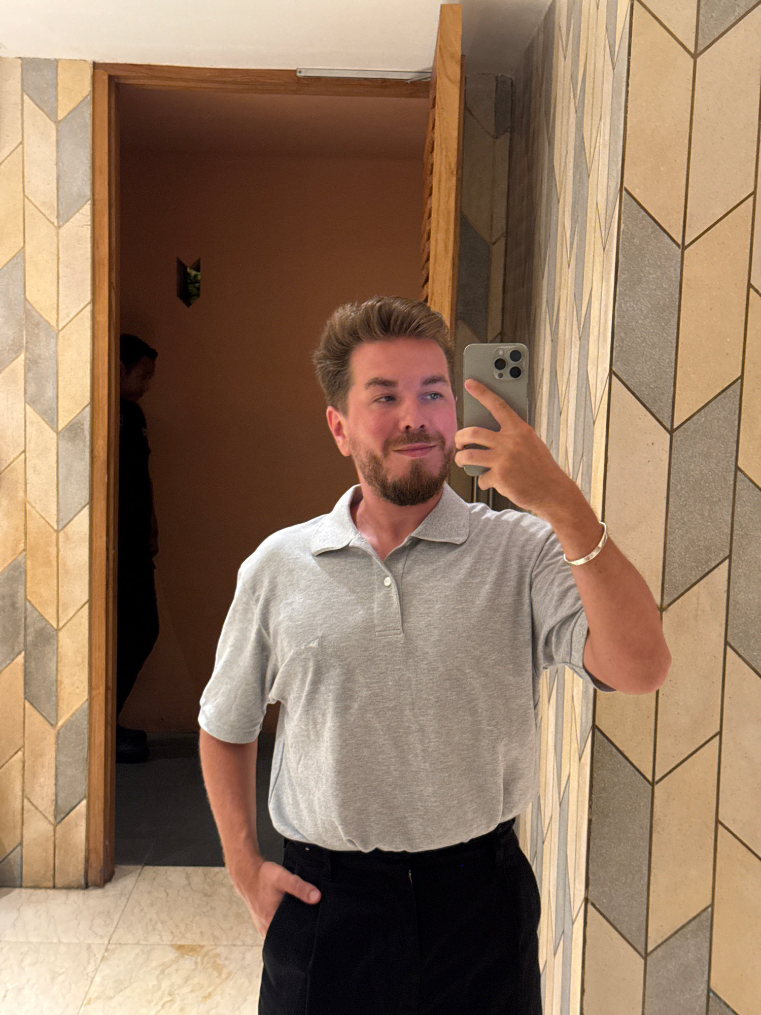 A man is taking a selfie in front of a mirror. The mirror reflects a room with a person lying in the dark. The setting appears to be a bathroom in North Kuta, Indonesia. The man has a beard, is wearin…read more