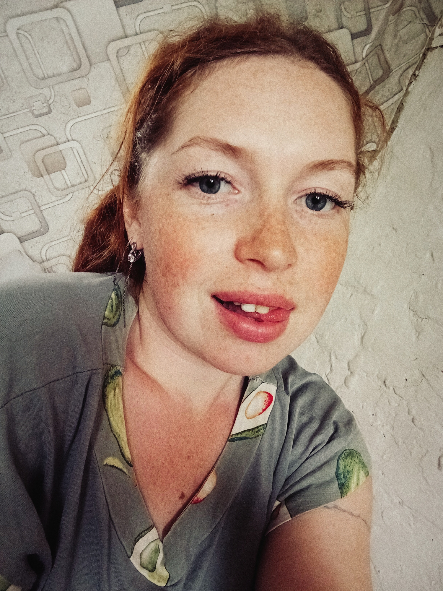 A fair-skinned, young, freckled woman with reddish-brown hair is pictured in a close-up selfie. Her eyes are blue. She is wearing a gray t-shirt with avocado prints. A silver necklace is visible on he…read more