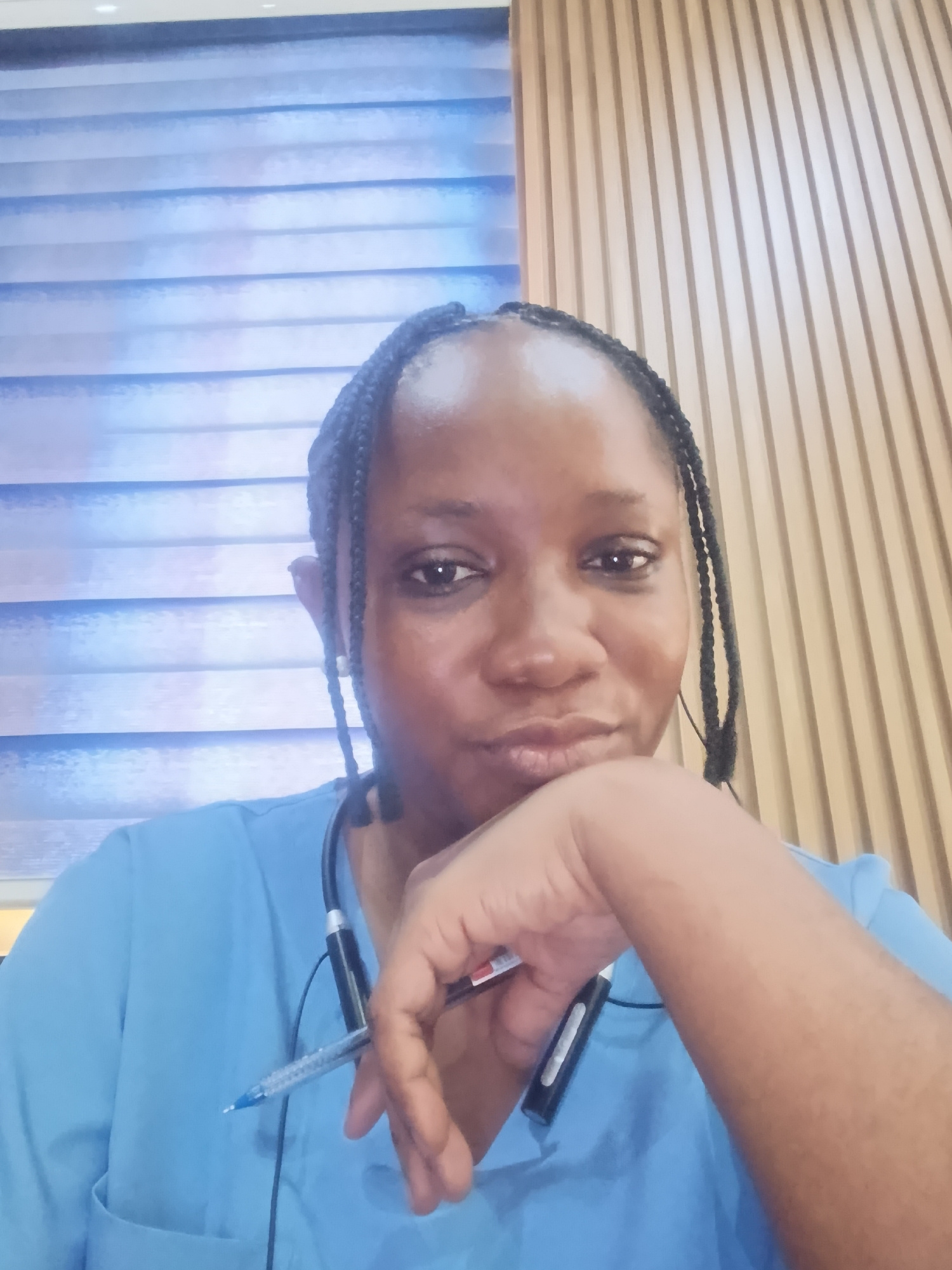 A medium shot shows a woman with dark skin and braided hair, wearing a blue top, likely scrubs, with a stethoscope around her neck. She is holding a pen in her right hand, resting her chin on her hand…read more