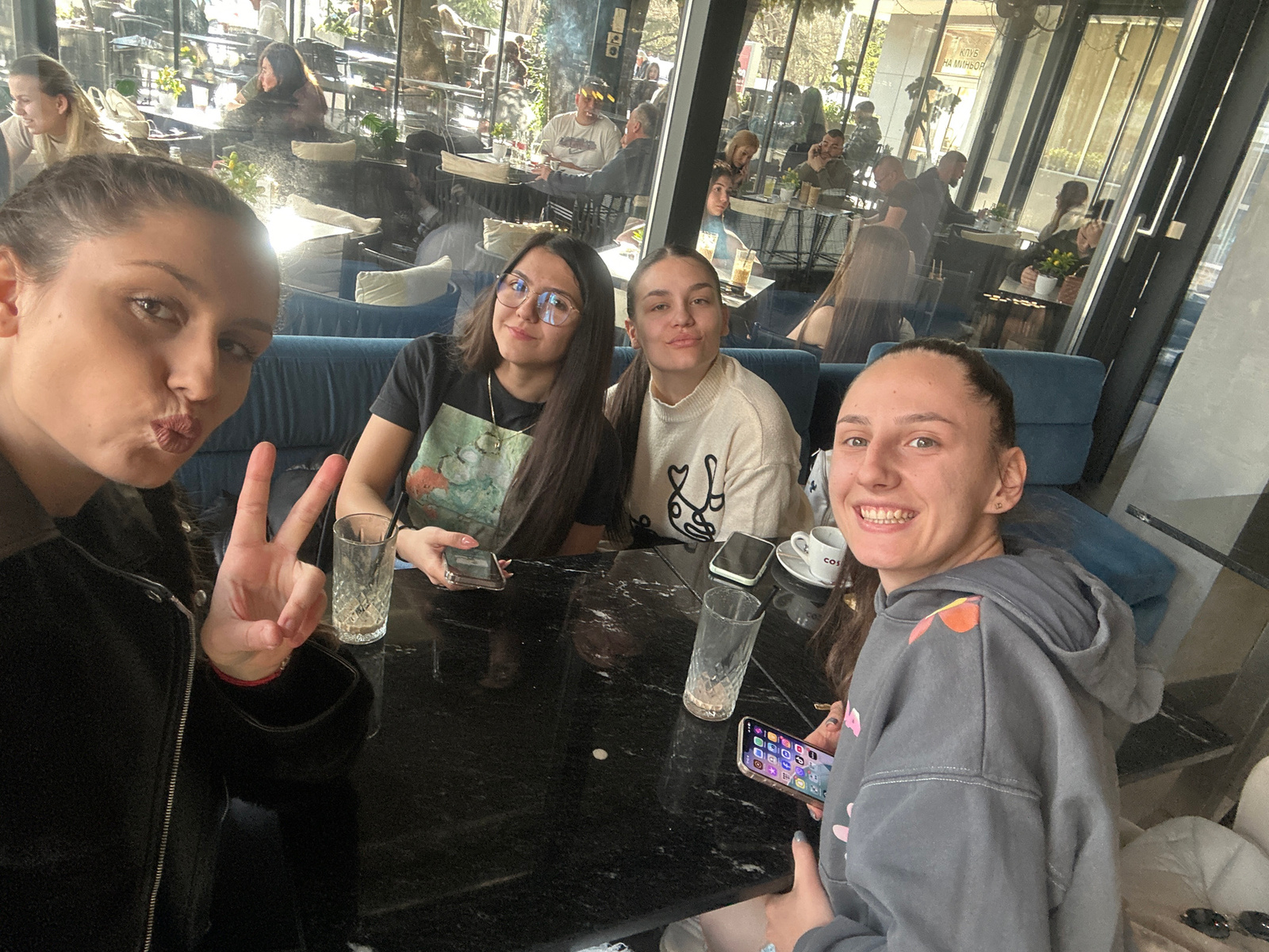 Four young women are seated around a dark-colored table in what appears to be a restaurant or cafe. The setting includes large windows providing a view of outdoor greenery and a reflection of the inte…read more