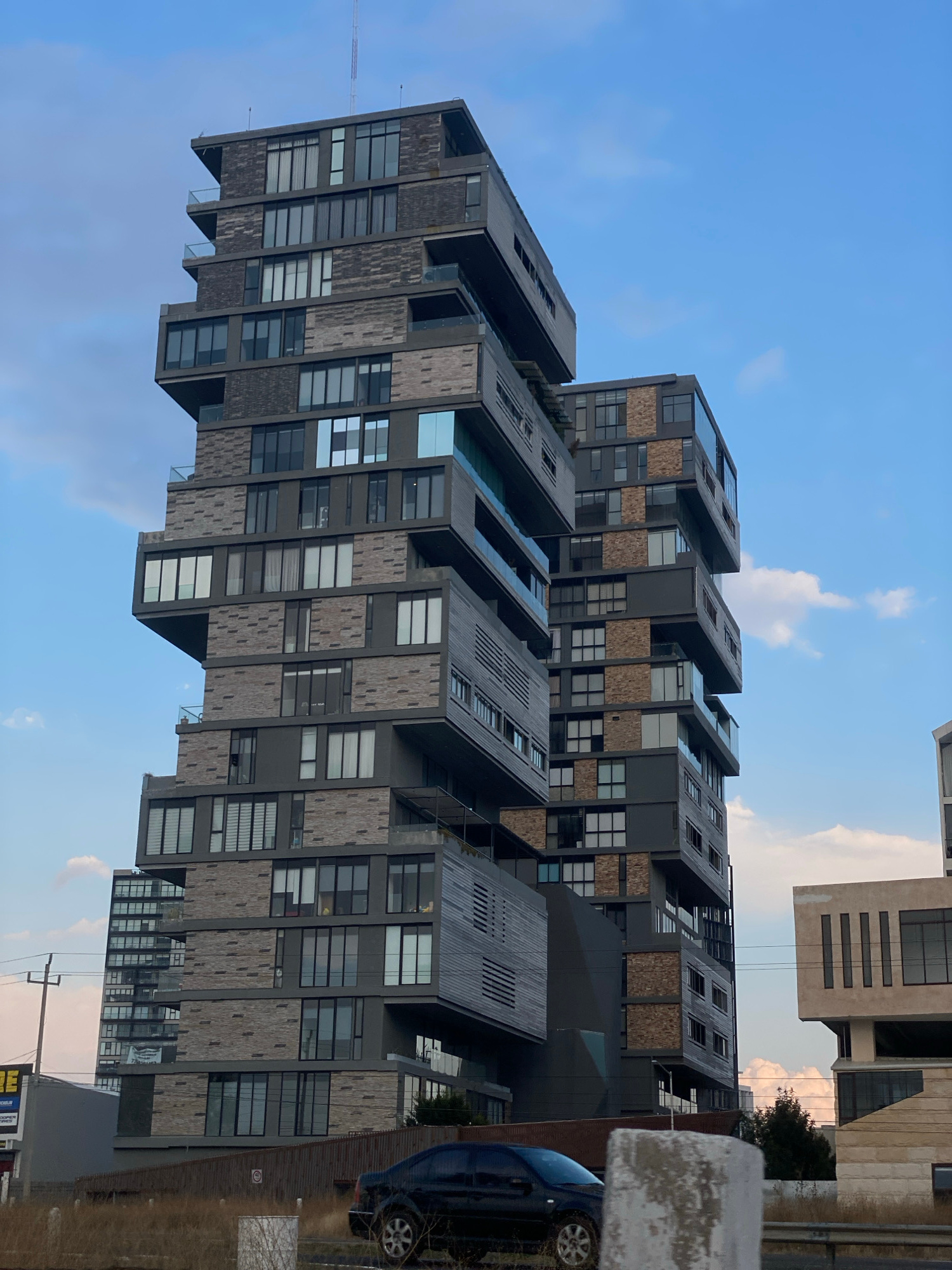 The image depicts a tall, modern apartment building in San Bernardino Tlaxcalancingo, Mexico. The building features a stacked, cantilevered design with alternating bands of windows and textured gray b…read more