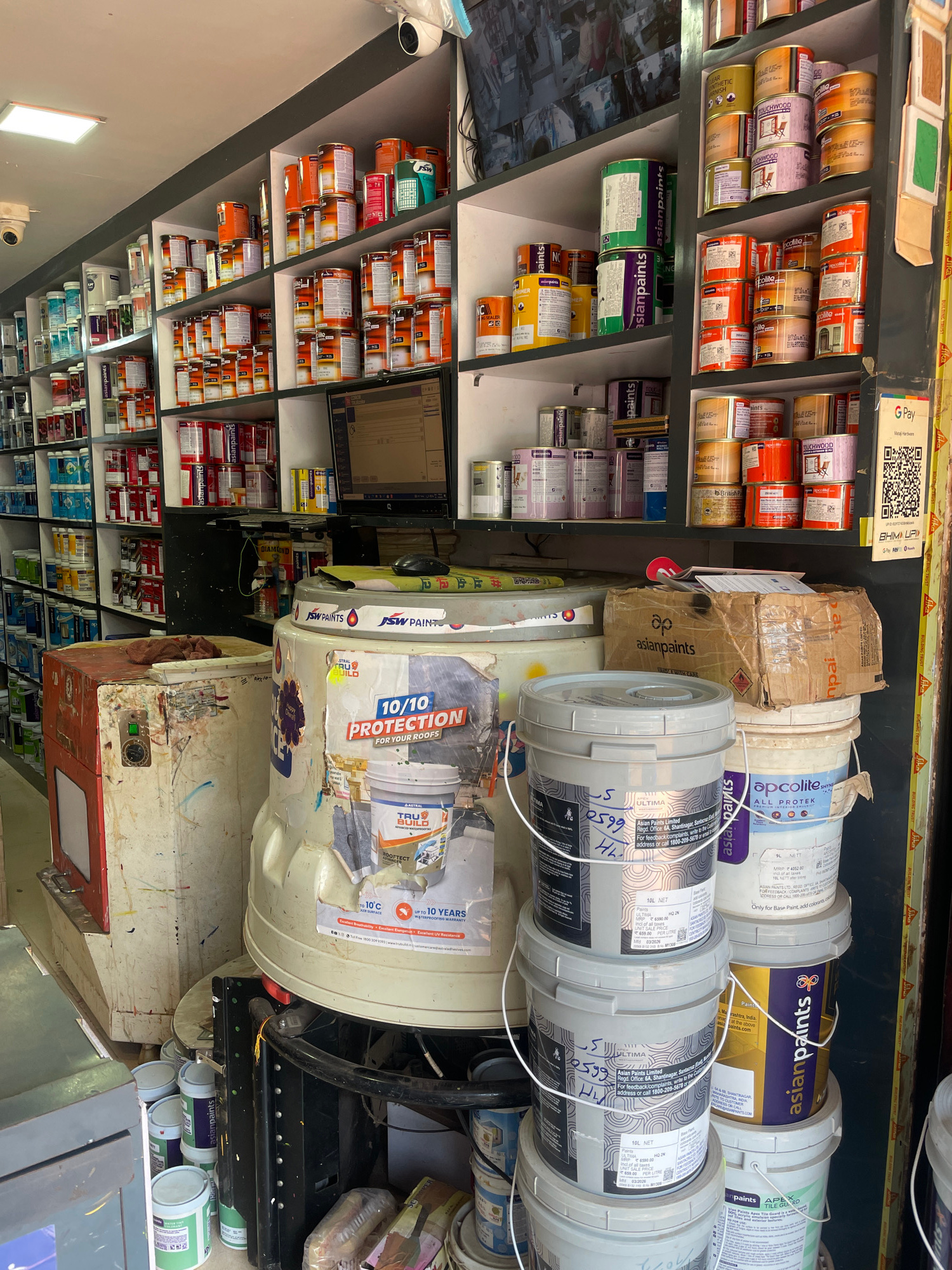 The image shows the interior of a paint store in Oxel, India. The shelves are stocked with numerous cans and buckets of paint from various brands, including Asian Paints, JSW Paints, and TruBuild. The…read more
