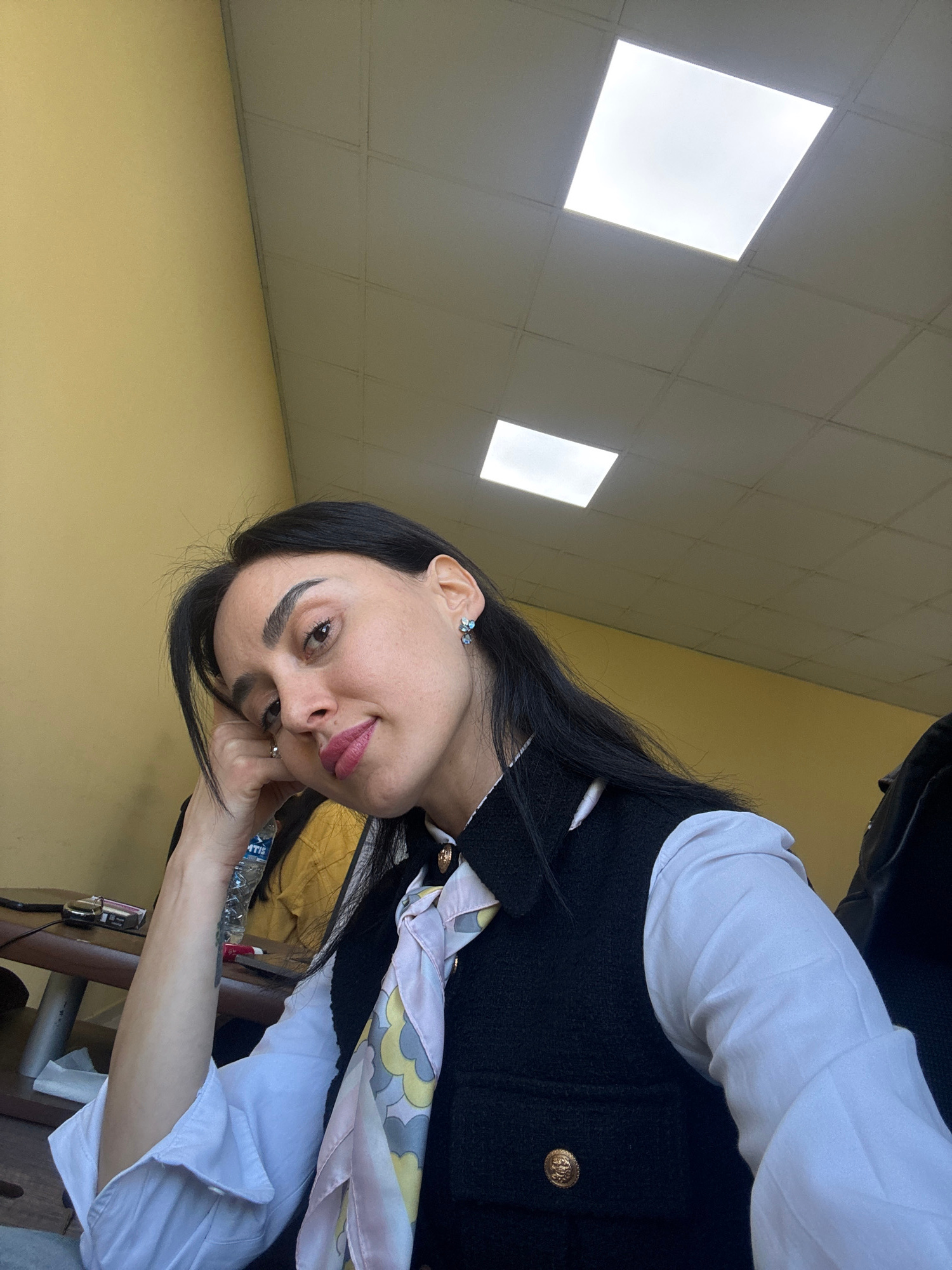 An indoor portrait displays a woman in what appears to be an office or public building in Tbilisi, Georgia. The image is oriented sideways, with the woman's head tilted towards her left shoulder, look…read more