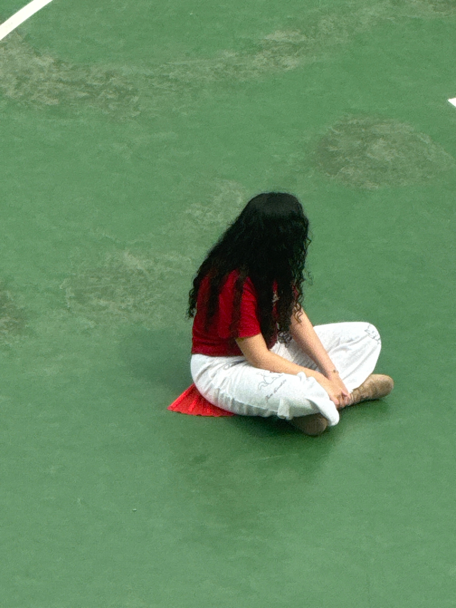 A woman with long, dark, curly hair is curled up in a fetal position on a green surface that appears to be a tennis court. She is wearing a red shirt and white pants. Her head is towards the left of t…read more