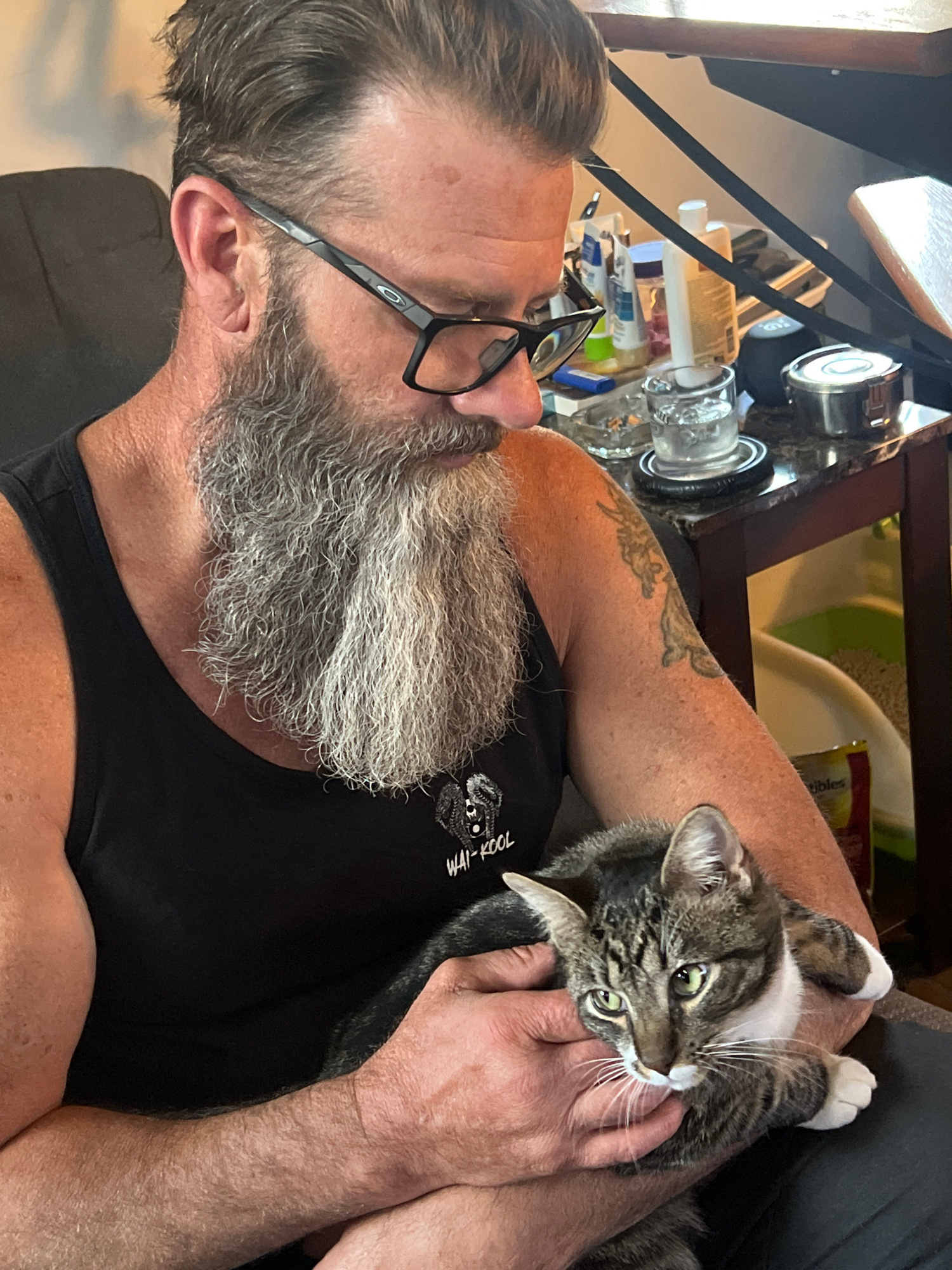 A close-up, candid shot shows a man with a graying beard and glasses holding a tabby cat with white paws. The man is wearing a black tank top. A table cluttered with miscellaneous items sits in the ba…read more
