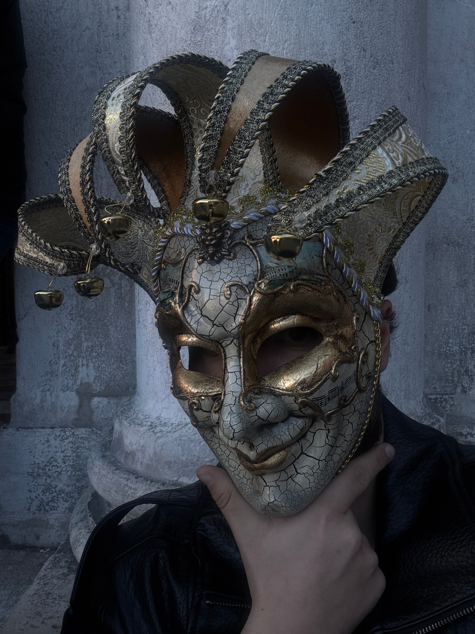 A medium close-up image depicts an individual wearing an elaborate Venetian carnival mask and an accompanying ornate headpiece. The mask is primarily cream-white with a distinct crackled texture, feat…read more