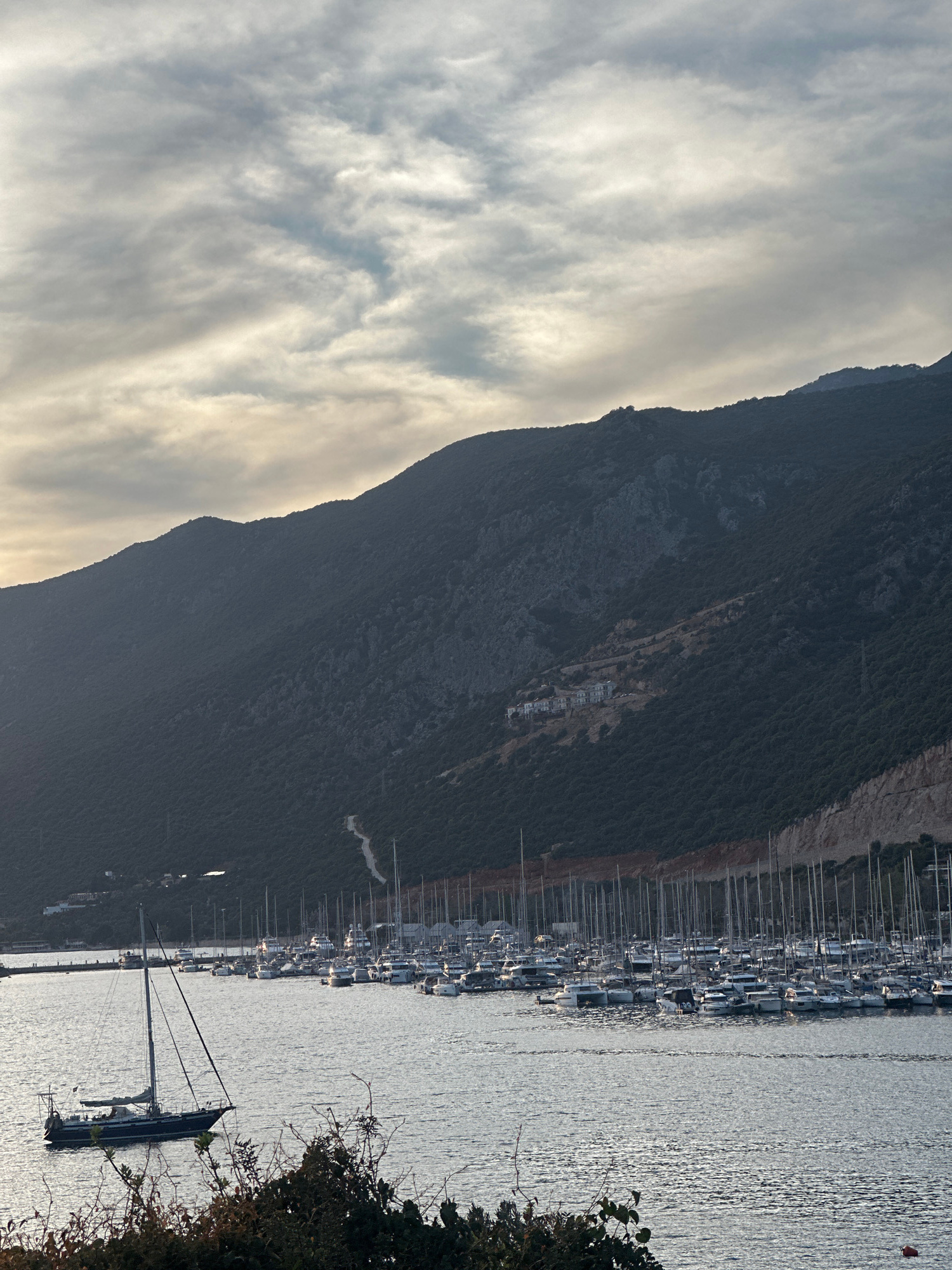 The image shows a marina on the water with a mountain in the background under a cloudy sky in Kaş, Turkey. The mountain is covered in green vegetation. A cluster of buildings sits on the hillside. A d…read more