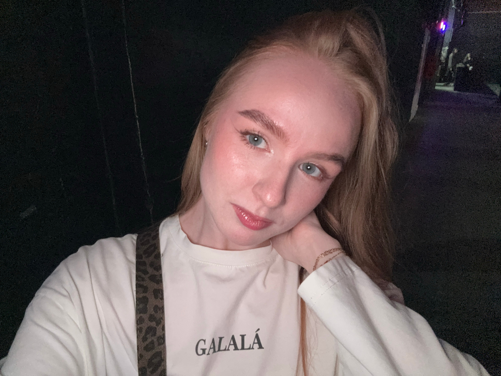A close-up, rotated portrait shows a young woman with fair skin, light hair, and blue eyes, looking directly at the camera. She appears to be in an indoor setting with low lighting, possibly a club or…read more