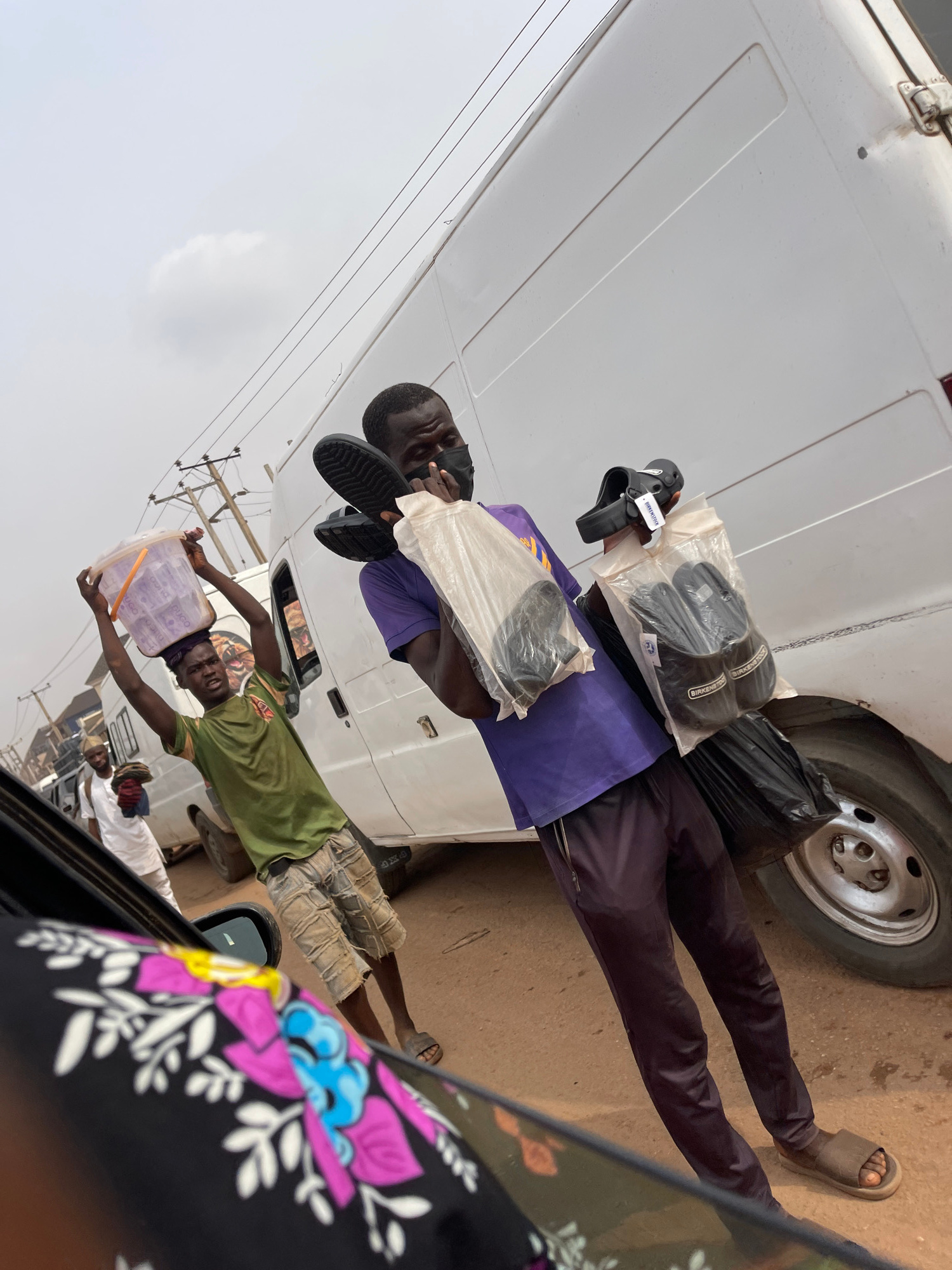 This image depicts a vibrant street vending scene in Ado, Nigeria, captured from the interior of a vehicle. The photograph is taken with a tilted perspective, looking out towards the street and other…read more