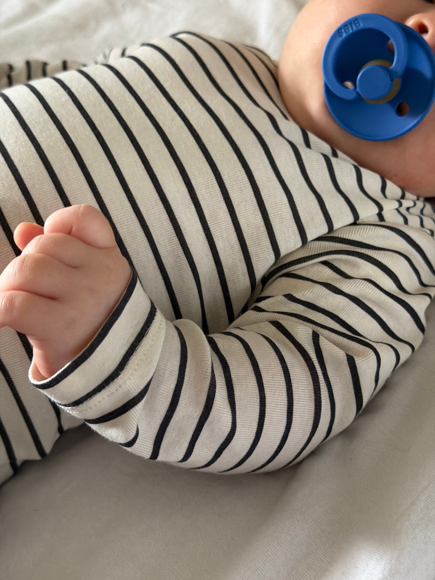 The image captures a close-up, high-angle view of a baby resting. The baby's head, partially visible on the left, features a prominent blue pacifier. The pacifier, a BIBS brand, has "BIBS" embossed on…read more