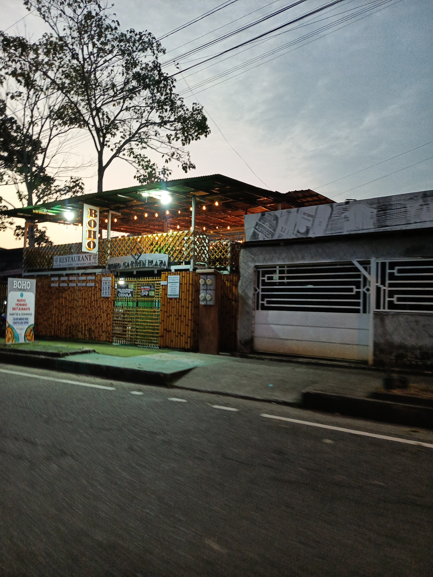 The image shows the front of the "Boho Garden Plaza" restaurant in Quevedo, Ecuador. The building has a bamboo facade and a sign that reads "Boho Restaurant" above the entrance. The restaurant also ha…read more